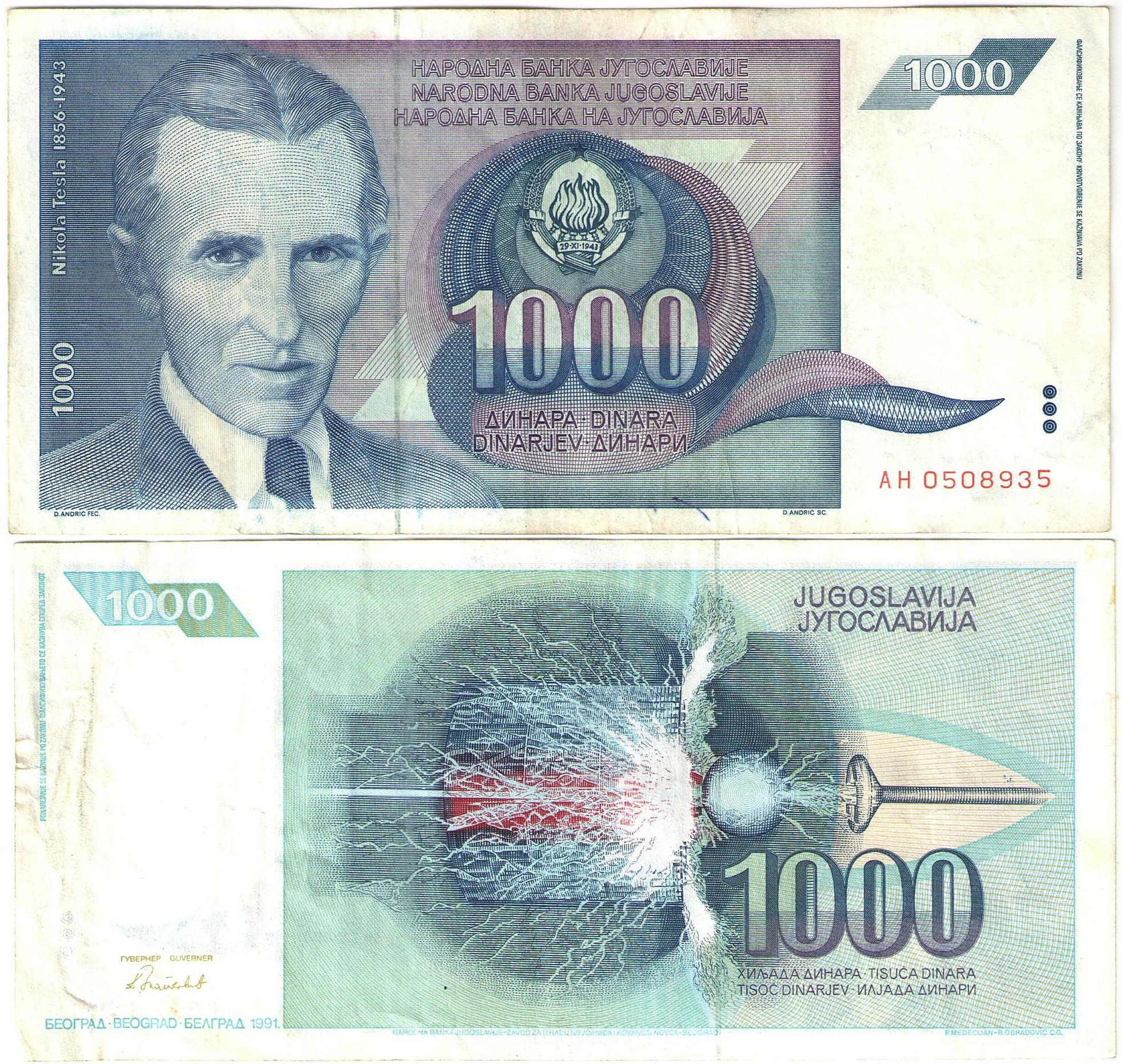 Оборотная сторона: по центру изображен трансформатор Теслы, а так же номинал банкноты: "1000 / ХИЛАДА ДИНАРА / TISUCA DINARA / TISOC DINARJEV / ИЛJАДИ ДИНАРИ". Выше официальное название страны на двух языках: "JUGOSLAVIJA / JУГОСЛАВИJА". В левом верхнем углу номинал цифрой - "1000". Снизу подписи управляющих и надпись: "БЕОГРАД BEOGRAD БЕЛГРАД 1991".