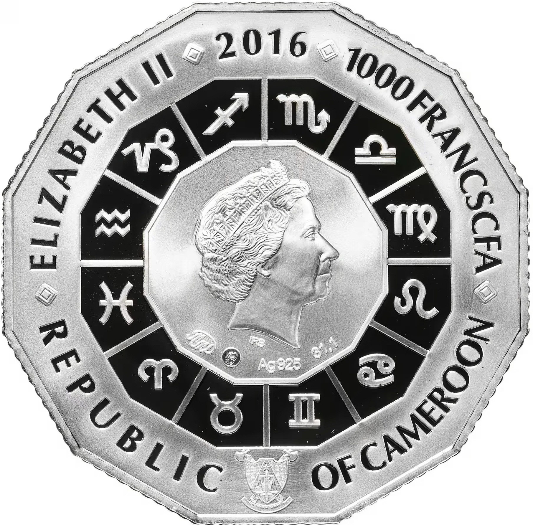Аверс: в центре изображен портрет Елизаветы II. Вдоль канта надписи: "ELIZABETH II 2016 REPUBLIC OF CAMEROON 1000 FRANCS CFA". Монета разделена на 12 секторов, в каждом секторе изображен символ каждого знака зодиака.