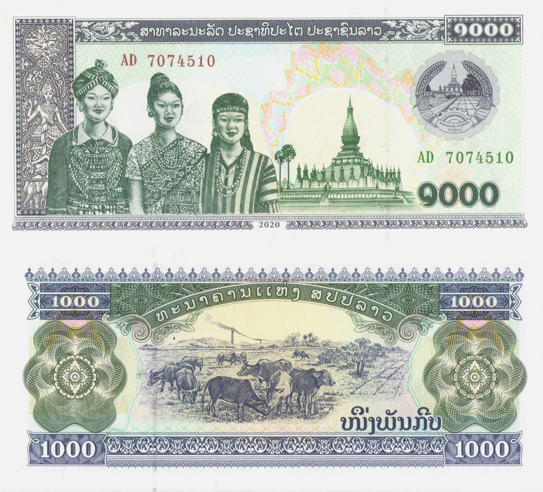 Лицевая сторона: в центре банкноты изображение Храма Пха Тат Луанг. Левеем изображение трех женщин. Над ними и в правом нижнем углу указан серийный номер. В правых углах так же находится номинал. Снизу по центру год образца банкноты: "2020".
