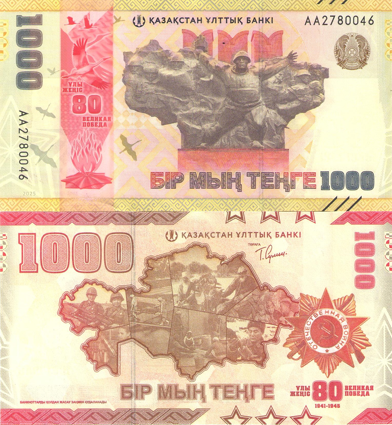 Оборотная сторона: карта Казахстана с фрагментами исторических архивных фотографий и Орден Отечественной войны.
