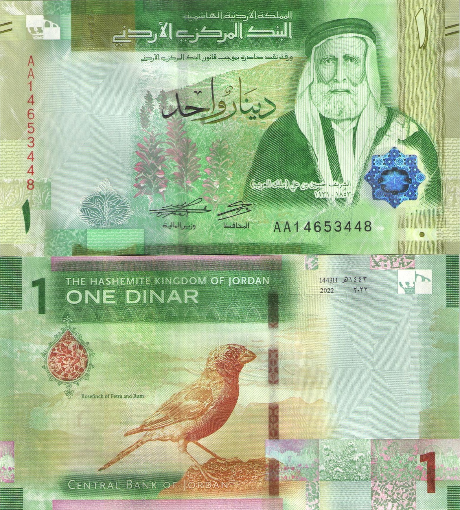 Обратная сторона: в левой части боны изображена розовая чечевица (род певчих птиц из семейства вьюрковых), обитающая в Вади-Раме и частично в Петре. Сверху наименование страны: "THE HASHEMITE KINGDOM OF JORDAN". Ниже номинал цифрой и прописью: "1 ONE DINAR". Правее год образца банкноты: "2022". В самом низу надпись: "CENTRAL BANK OF JORDAN".