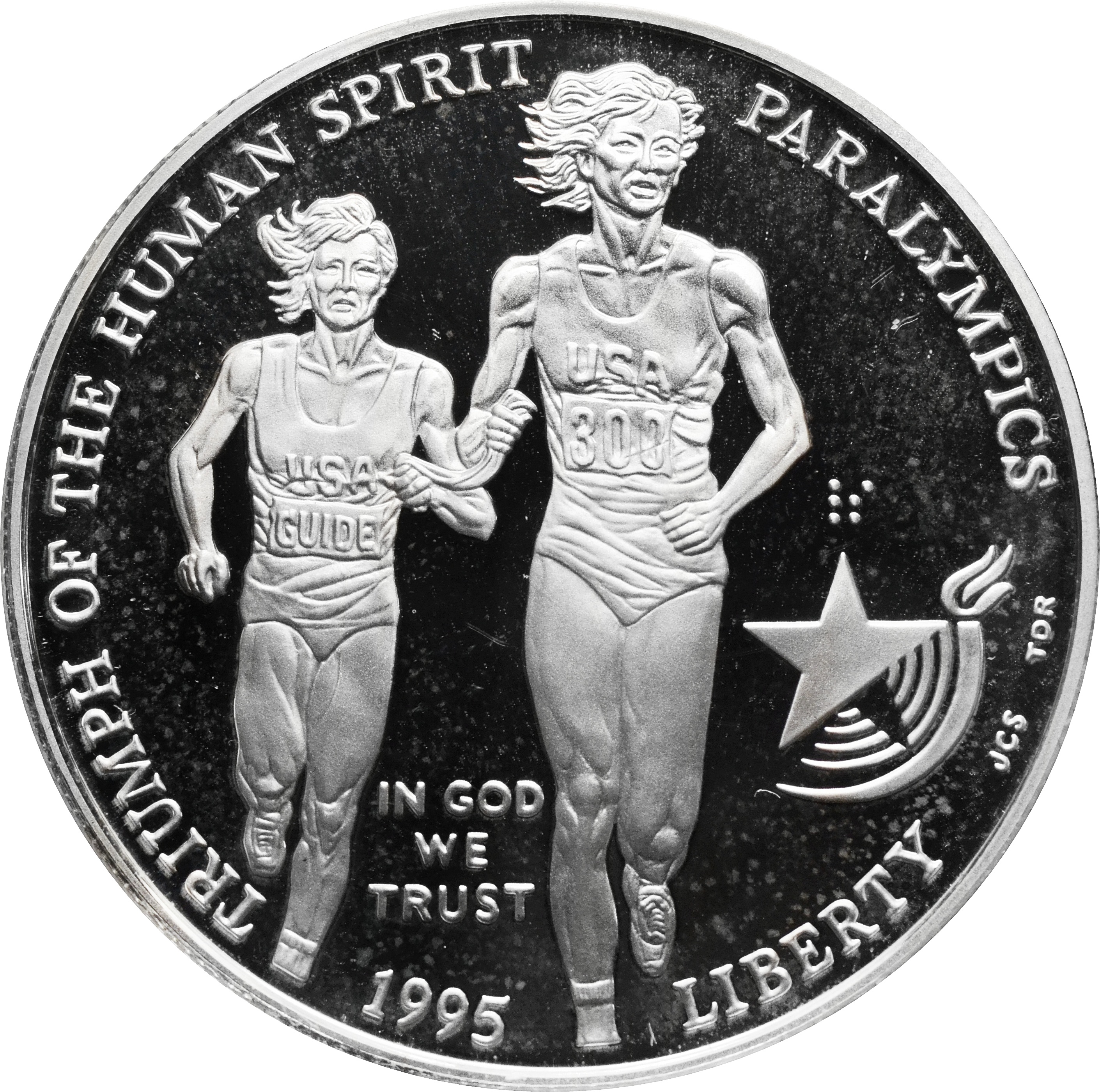 Аверс: в центре монеты изображены две спортсменки паралимпийских игр, помогающие друг другу. Справа расположена эмблема Паралимпийских Игр в Атланте. По центру в три строки размещён девиз США: "IN GOD WE TRUST". В самом низу располагается год чеканки: "1995". Полукругом по краю надпись: "TRIUMPH OF THE HUMAN SPIRIT PARALYMPICS LIBERTY".