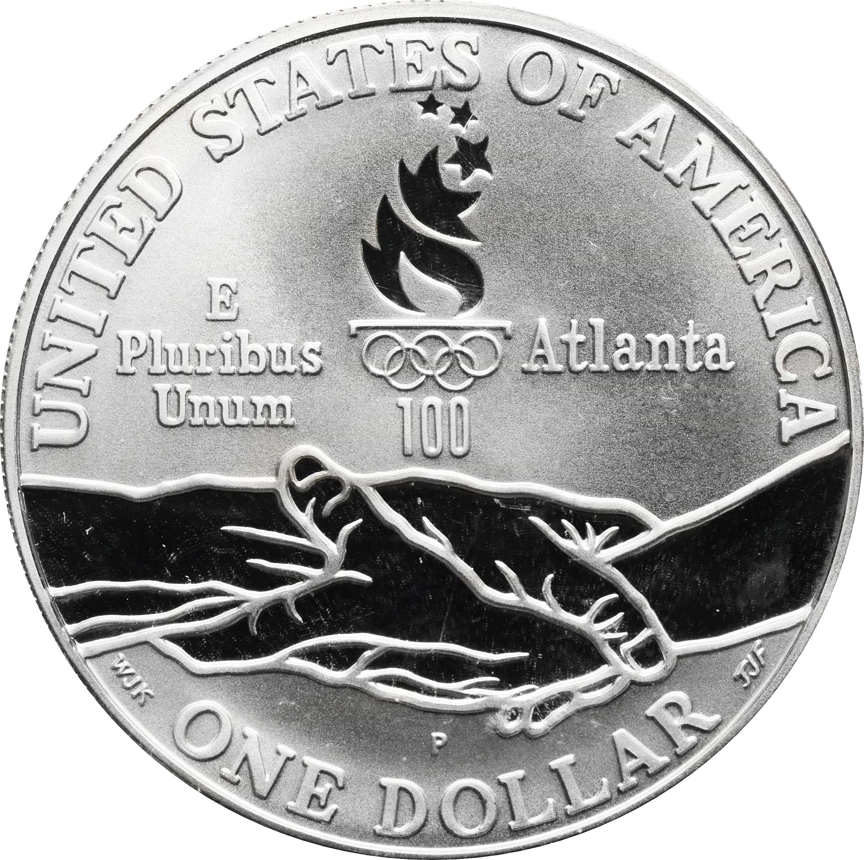 Реверс: по центру изображены стилизованные руки спортсменов, помогающие друг другу. В верхней части расположен девиз США: "E PLURIBUS UNUM", логотип Олимпийских Игр в Атланте и название города, принимающего игры: "Atlanta". Внизу по центру указан номинал монеты: "ONE DOLLAR". Сверху полукругом по краю монеты отчеканено название страны-эмитента: "UNITED STATES OF AMERICA".