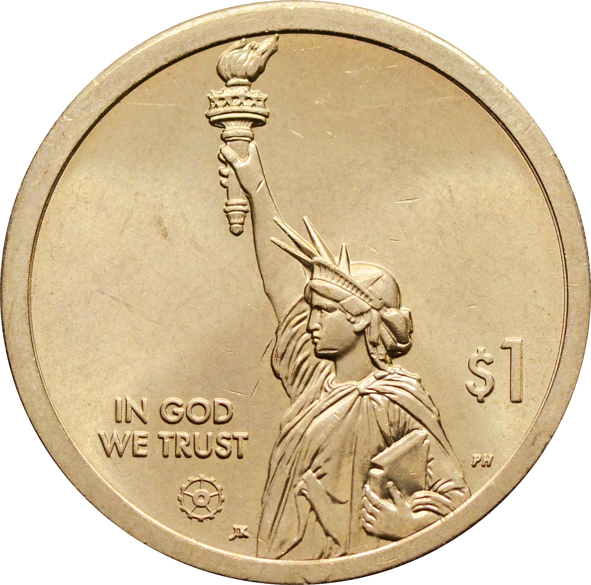 Реверс: по центру расположено изображение Статуи свободы, рядом с которой указан номинал: "$1". Левее надпись: "IN GOD WE TRUST".