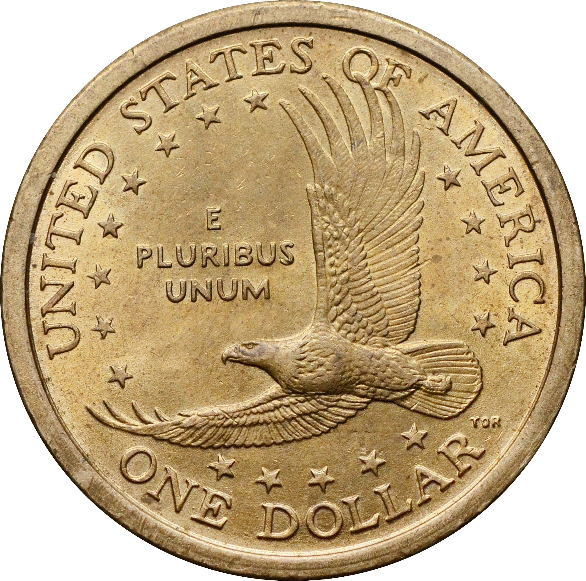 Реверс: по центру расположен символ Америки - орел. Сверху, полукругом, надпись: "UNITED STATES OF AMERICA". Снизу указан номинал: "ONE DOLLAR". Сразу над орлом надпись: "E PLURIBUS UNUM".