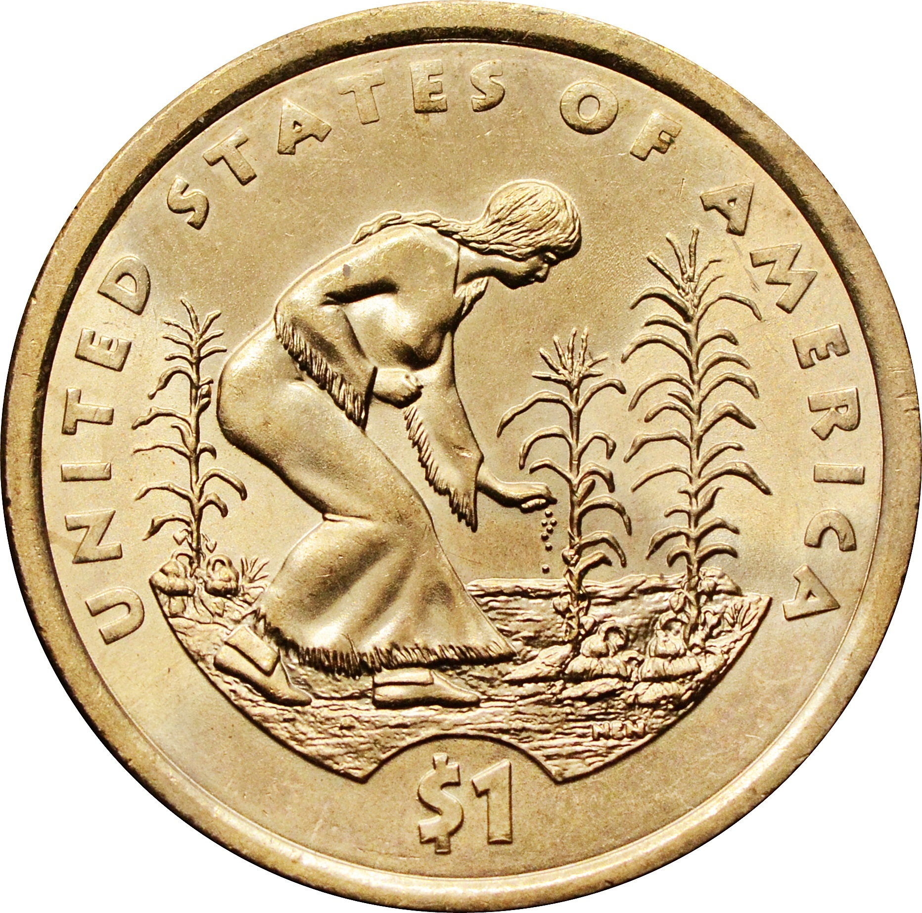 Реверс: по центру индейская женщина, возделывающая кукурузу (маис), бобы и тыкву. Сверху, полукругом, надпись: "UNITED STATES OF AMERICA". Снизу указан номинал: "1$".