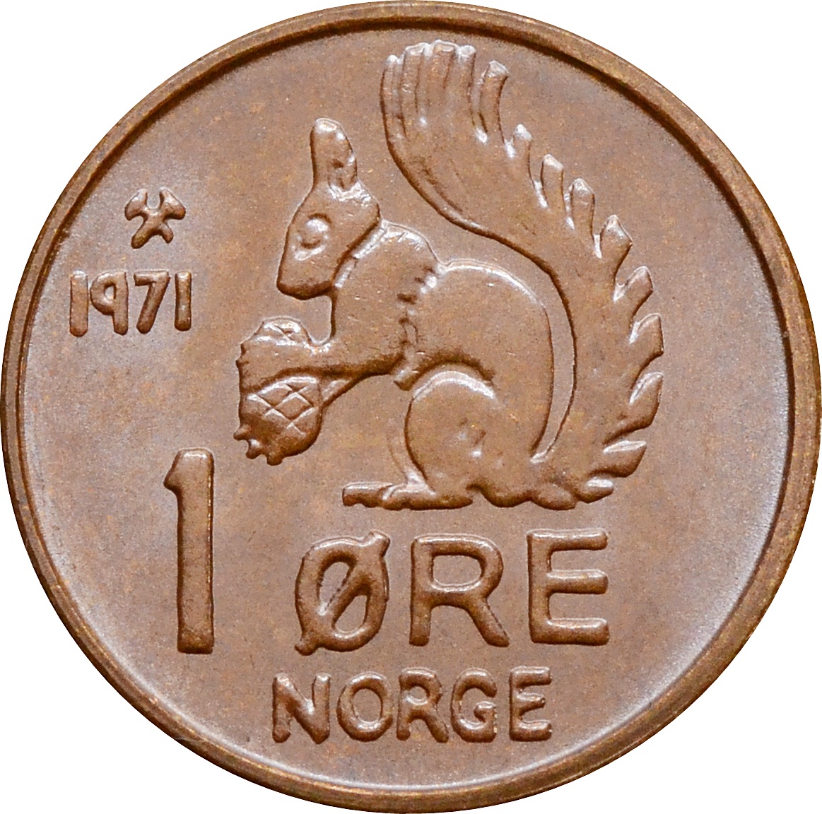 Реверс: чуть выше центра изображение белки с орехом, сразу под ней указан номинал: "1 ØRE", а снизу название страны: "NORGE". Левее от белки указан год чеканки: "1971".