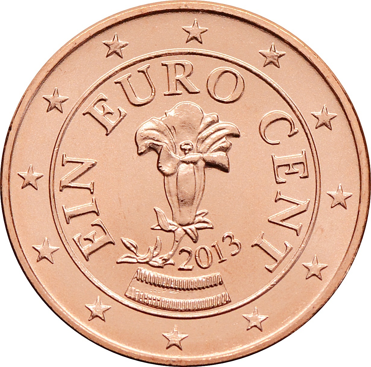 Аверс: по центру изображение цветка альпийской горечавки и надпись: "EIN EURO CENT". Ниже год чеканки: "2013" и флаг страны. Вдоль канта, по кругу, 12 звёзд.