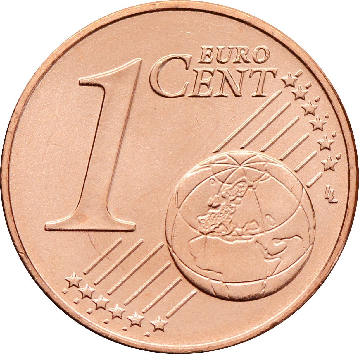 Реверс: в центре указан номинал монеты: "1 EURO CENT". От нижнего левого к верхнему правому краю, по диагонали, проходят шесть линий, на концах которых расположено 12 звёзд. Справа внизу на середине линий изображён земной шар, на переднем плане земного шара представлена европейская часть континента.