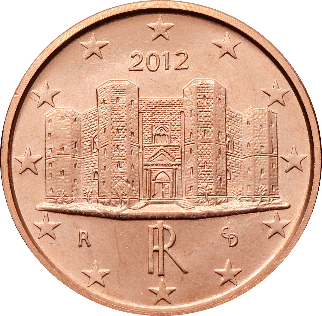 Аверс: по центру изображен замок Кастель-дель-Монте в городе Андрия. Выше год чеканки: "2012". Снизу расположены буквы: "IR" — Итальянская Республика, буква "R" — знак итальянского монетного двора и подпись художника - "ED". Вдоль канта, по кругу, 12 звёзд.