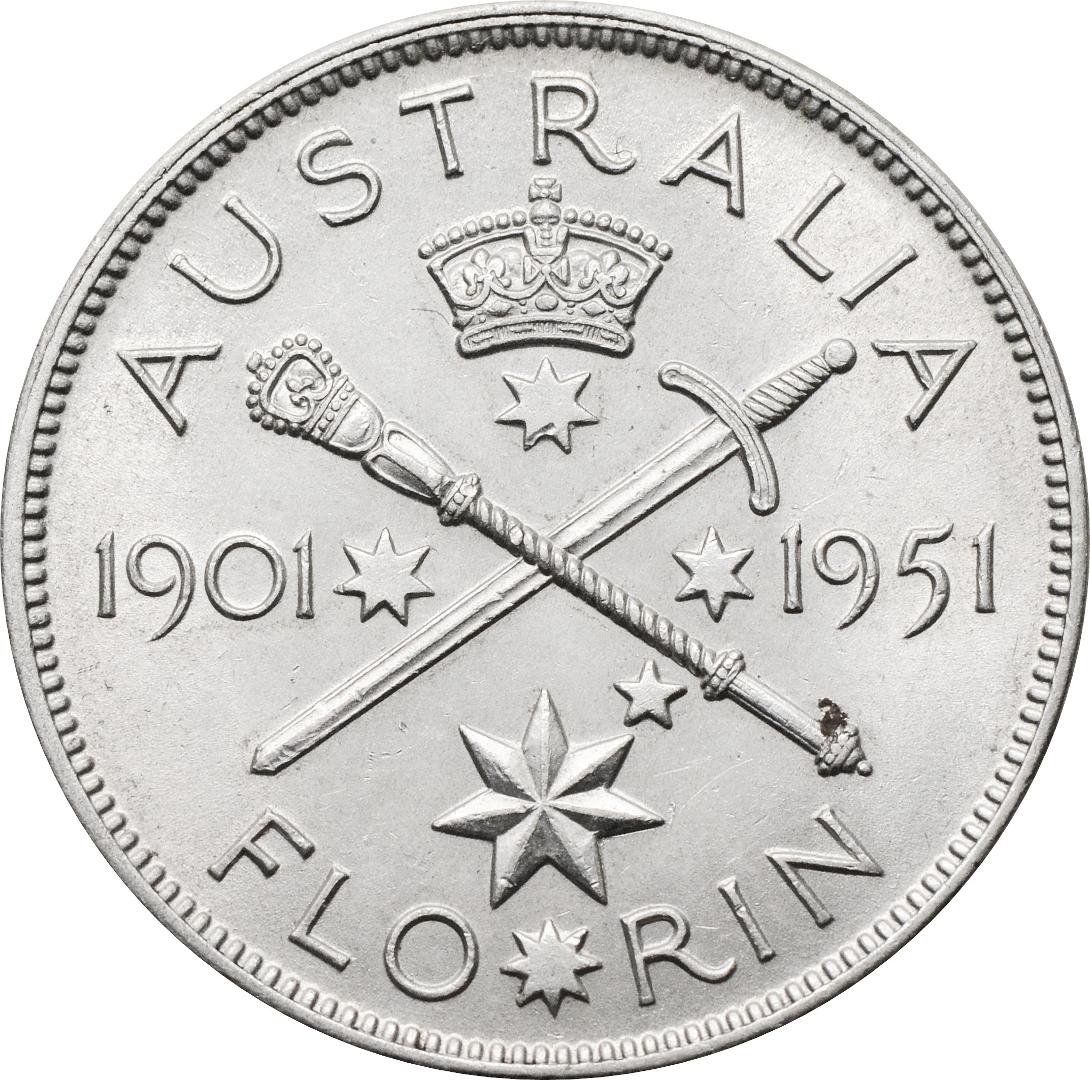 Реверс: по центру изображены меч и скипетр разделяющие дату - 1901-1951. Сверху наименование страны: "AUSTRALIA". Снизу указан номинал: "FLORIN".
