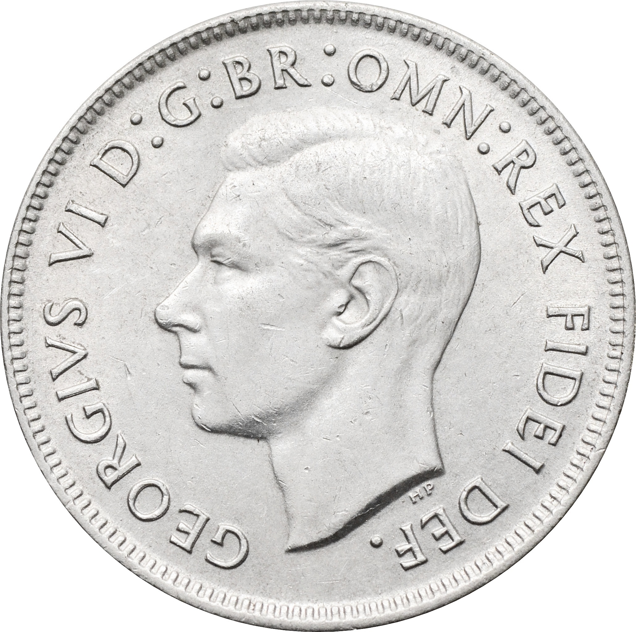 Аверс: в центре монеты размещен портрет короля Георга 6 и надпись по кругу: "GEORGIVS VI D:G:BR:OMN:REX FIDEI DEF.".