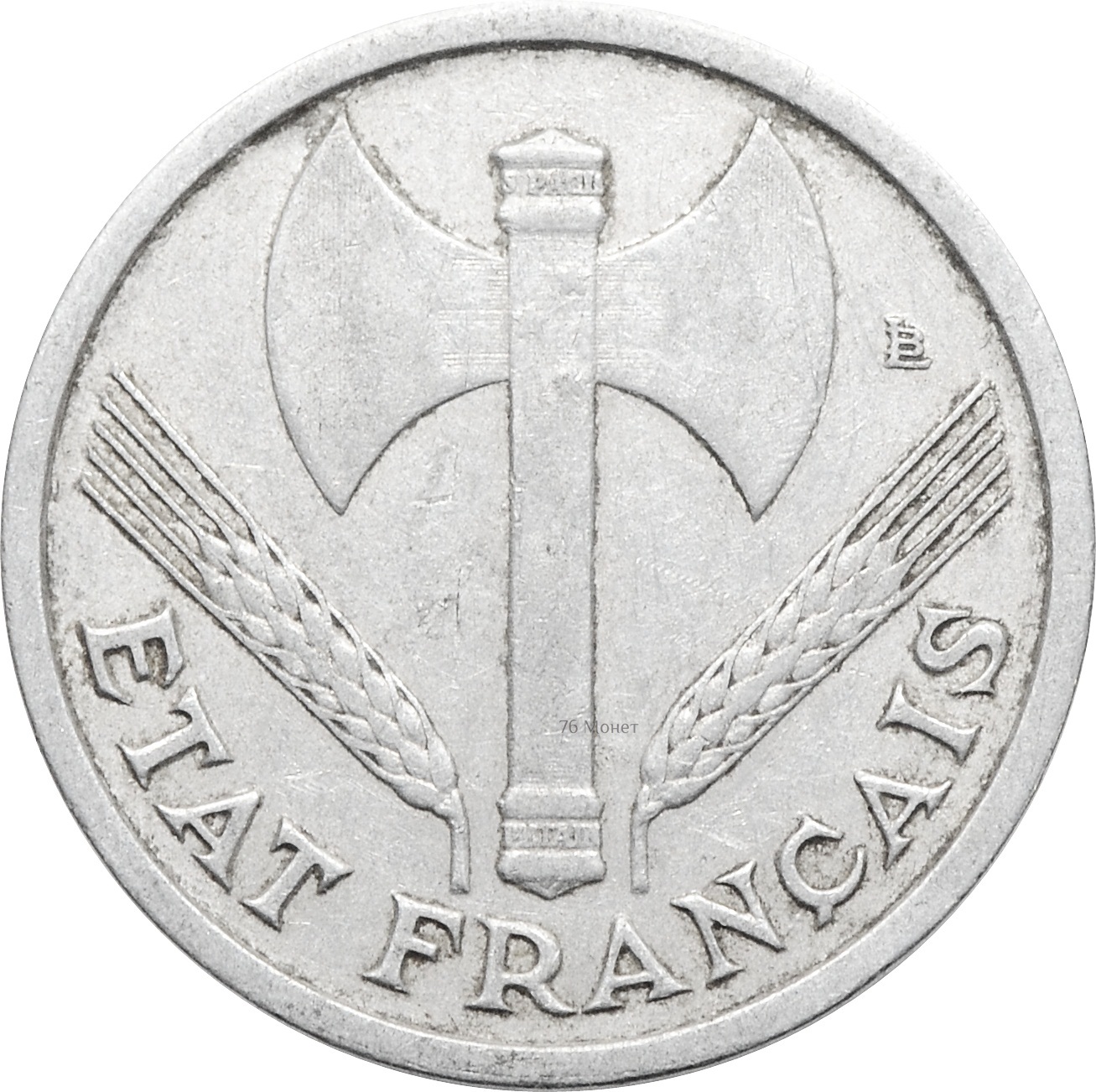 Аверс: в центре монеты изображен герб Вишистского правительства - средневековый топорик.