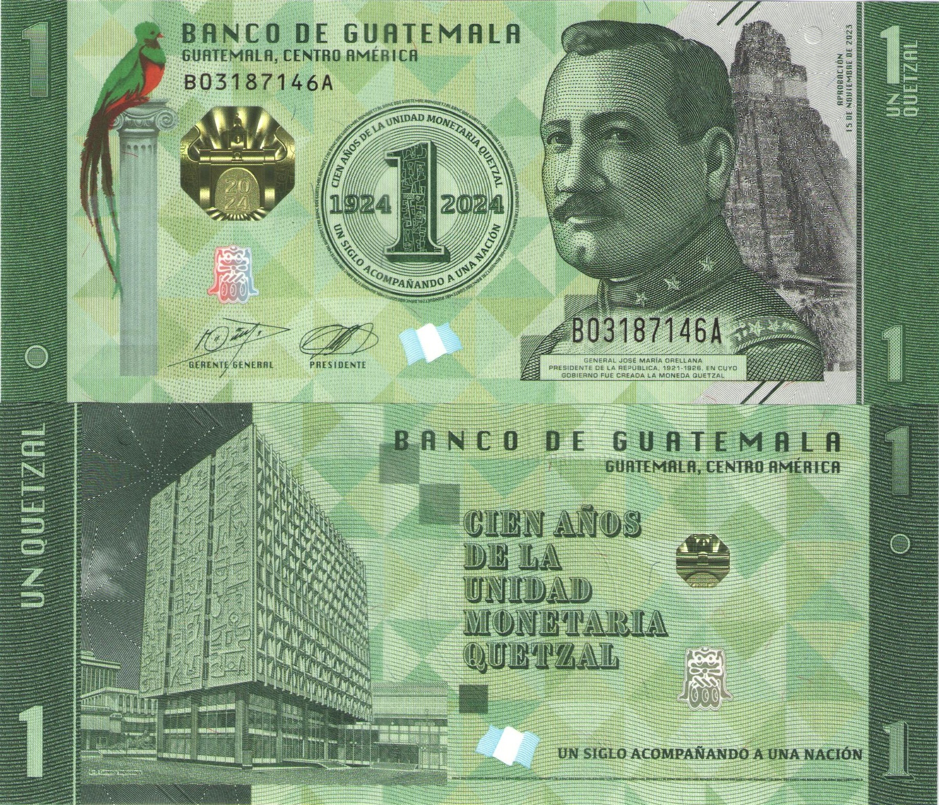Оборотная сторона: по центру находится изображено здание Центрального банка Гватемалы в Гватемала-Сити, надпись: «100 лет денежной единицы Кетцаль», гватемальский флаг и майянские символы. Сверху надпись: "BANCO DE GUATEMALA". . Слева номинал прописью: "1 UN QUETZAL".