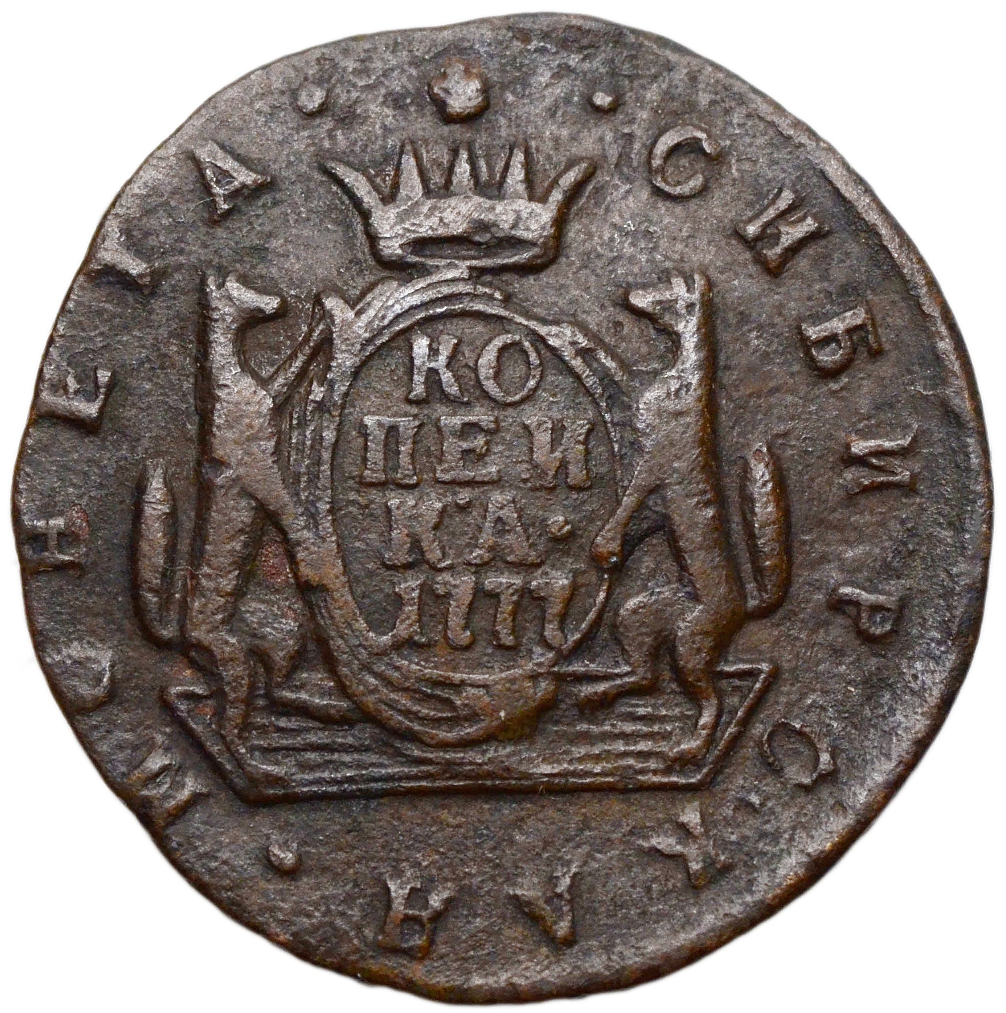 Реверс: в центре изображен картуш с надписью в три строки: "ОДНА КОПЕИКА", ниже год чеканки: "1777". Картуш, с обеих сторон, поддерживается двумя соболями. Выше царская корона. По окружности, вдоль канта, надпись: "СИБИРСКАЯ МОНЕТА"