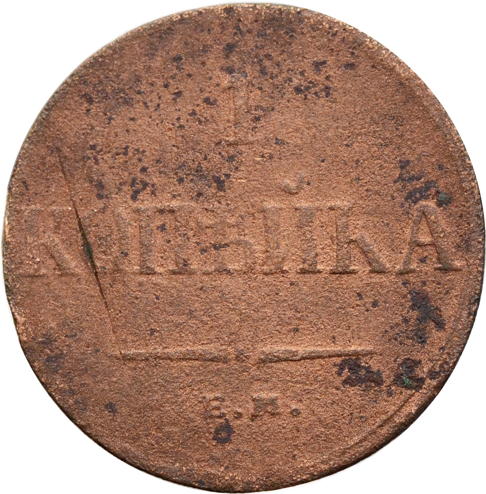 Реверс: по центру указан номинал в две строки: "1 КОПѢЙКА". Под надписью расположен декоративный разделитель в виде двух фигурных линий и небольшой точки между ними. Ниже, под разделителем обозначение монетного двора: "Е.М.".