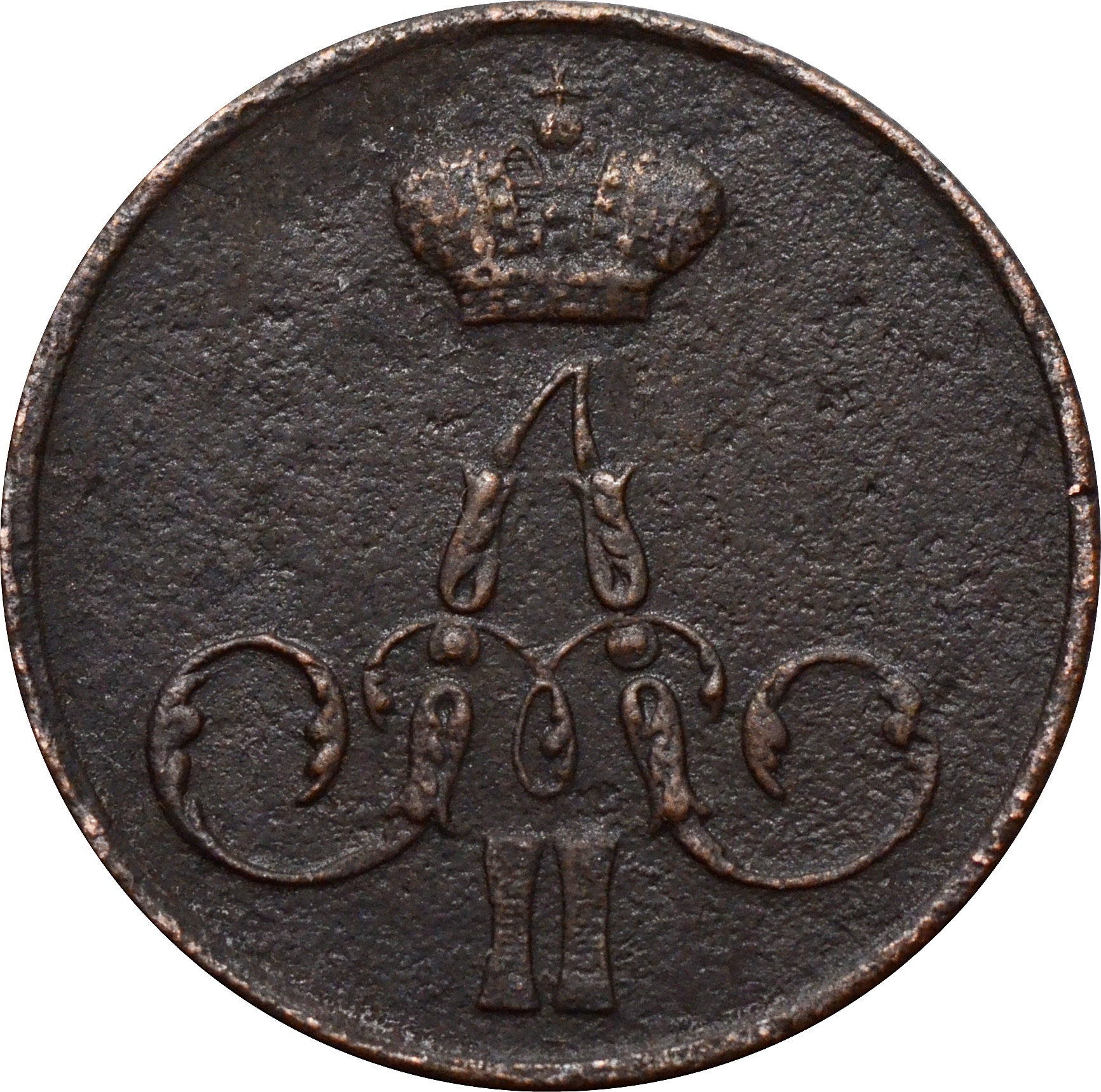 Монета 1 копейка 1855 ЕМ Александр II в состоянии VF-XF (очень хорошее).