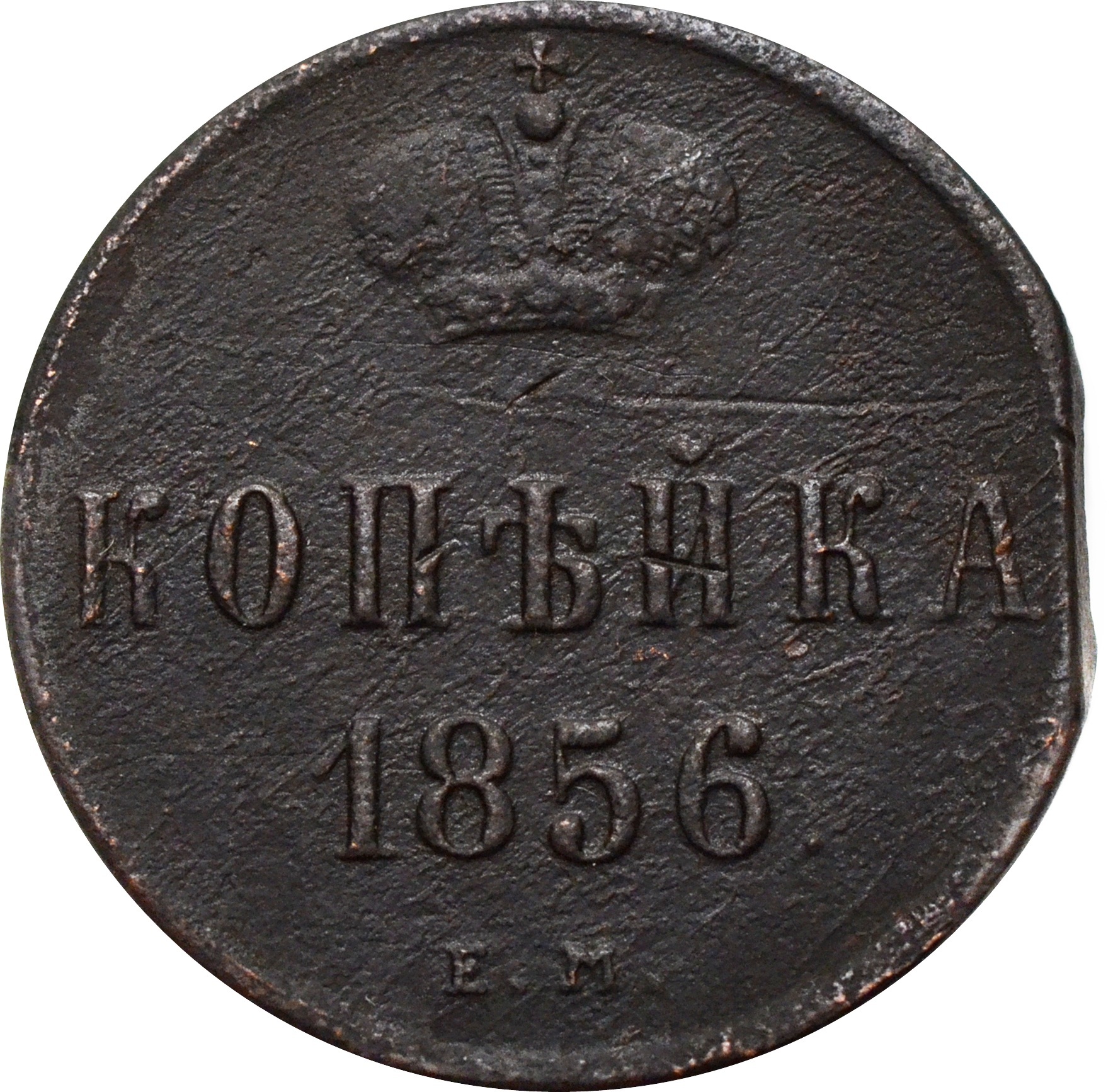 Реверс: в центре указан номинал: "КОПЕЙКА". Под ним указание года чеканки: "1856" и обозначение монетного двора: "Е. М".