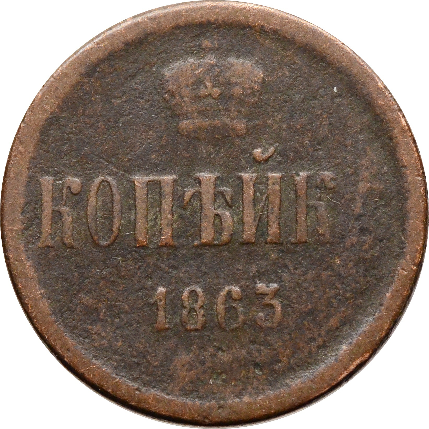 Реверс: в центре указан номинал: "КОПЕЙКА". Под ним указание года чеканки: "1863" и обозначение монетного двора: "Е. М.".