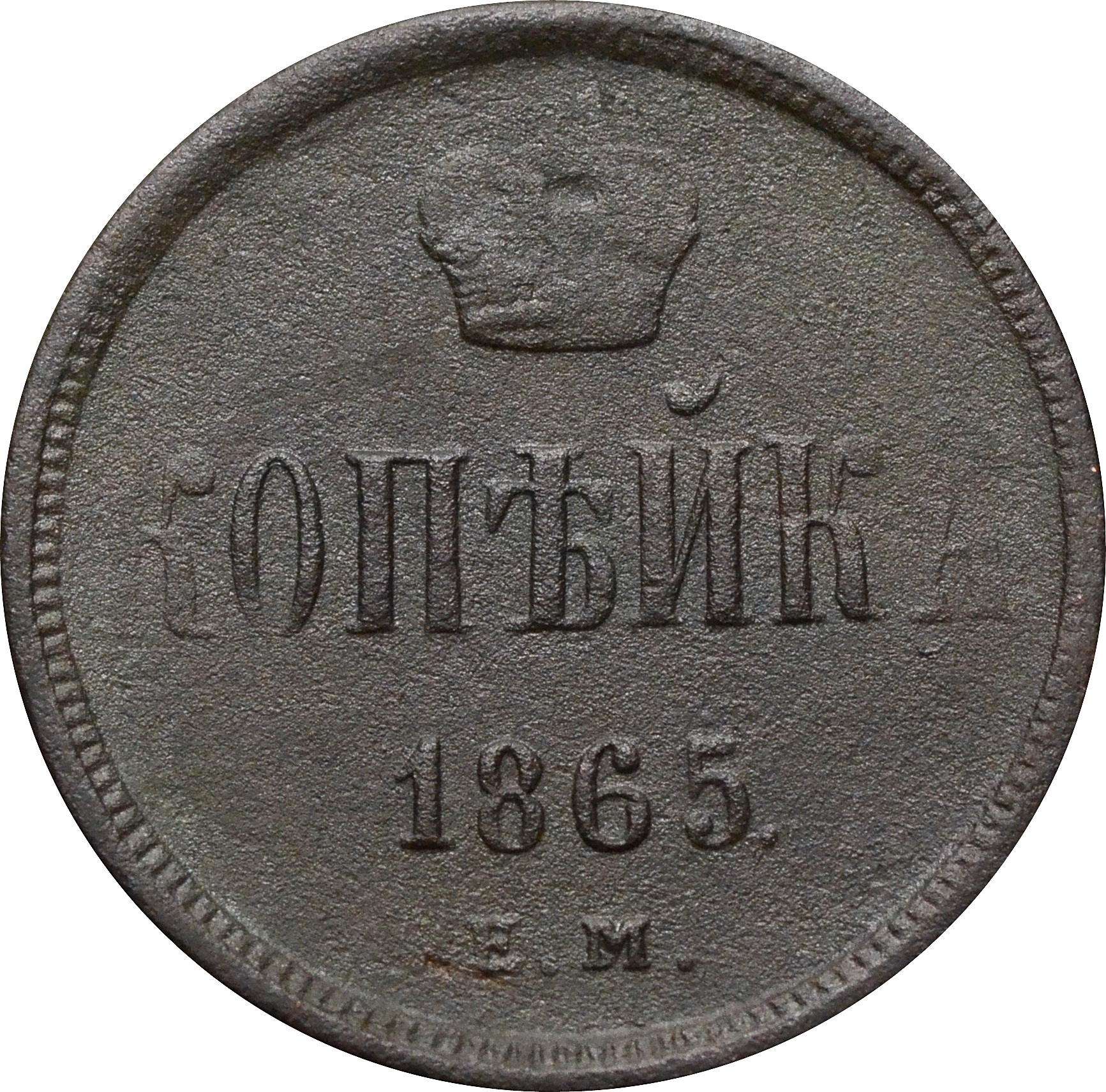 Реверс: в центре указан номинал: "КОПЕЙКА". Под ним указание года чеканки: "1865" и обозначение монетного двора: "Е. М.".
