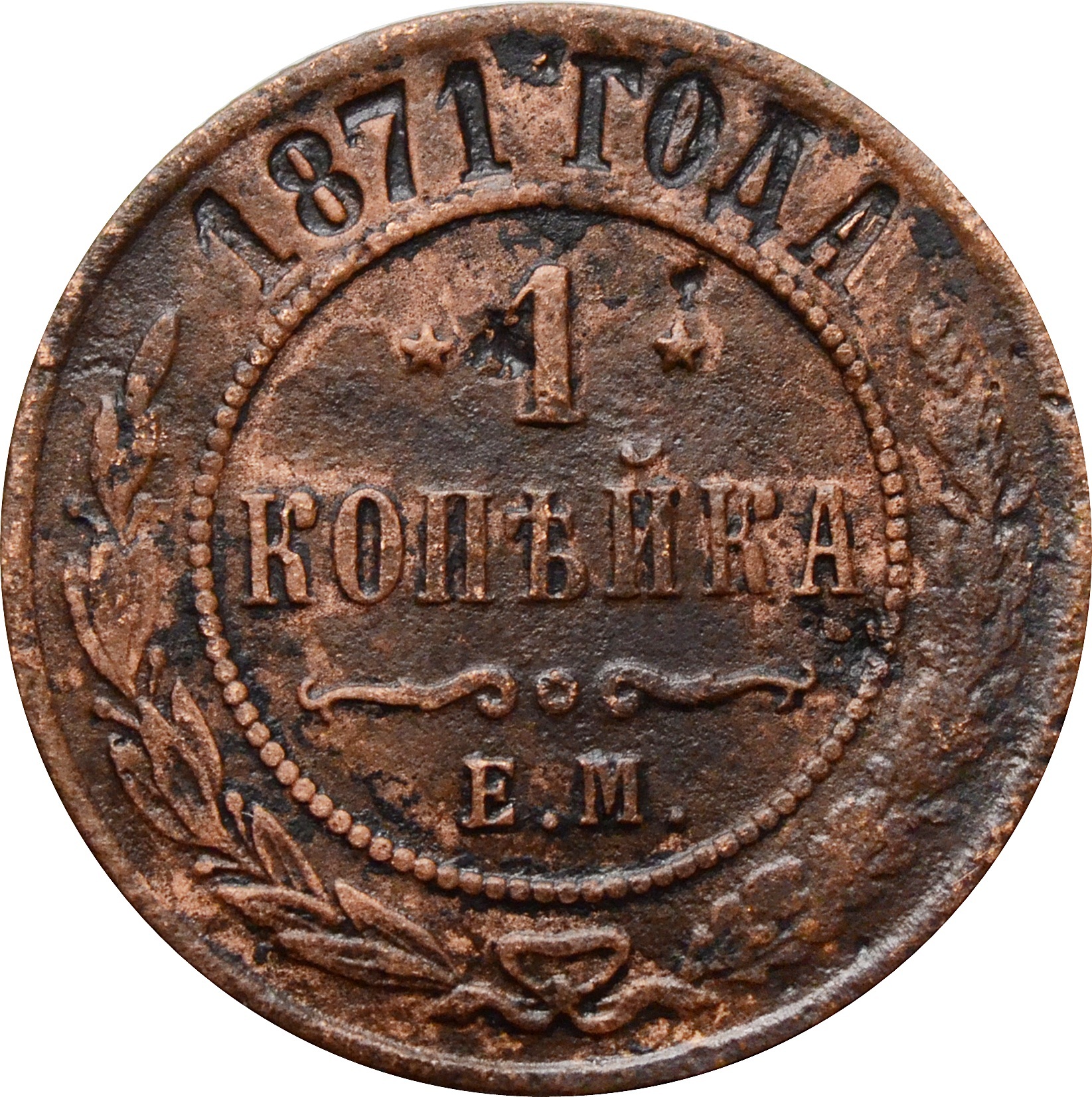 Реверс: в центре указан номинал: "1 КОПЕЙКА". Под номиналом, расположен декоративный разделитель. Под разделителем можно увидеть обозначение монетного двора: "ЕМ". Центральная часть отделена от остального изображения, окружностью в виде точек. В верхней части полукругом, вдоль канта, расположен год чеканки: "1871 ГОДА". Ниже этой надписи, вдоль канта, изображен венок из лавровой и дубовой ветвей, которые, в нижней части, перевязаны лентой на узел бантом.