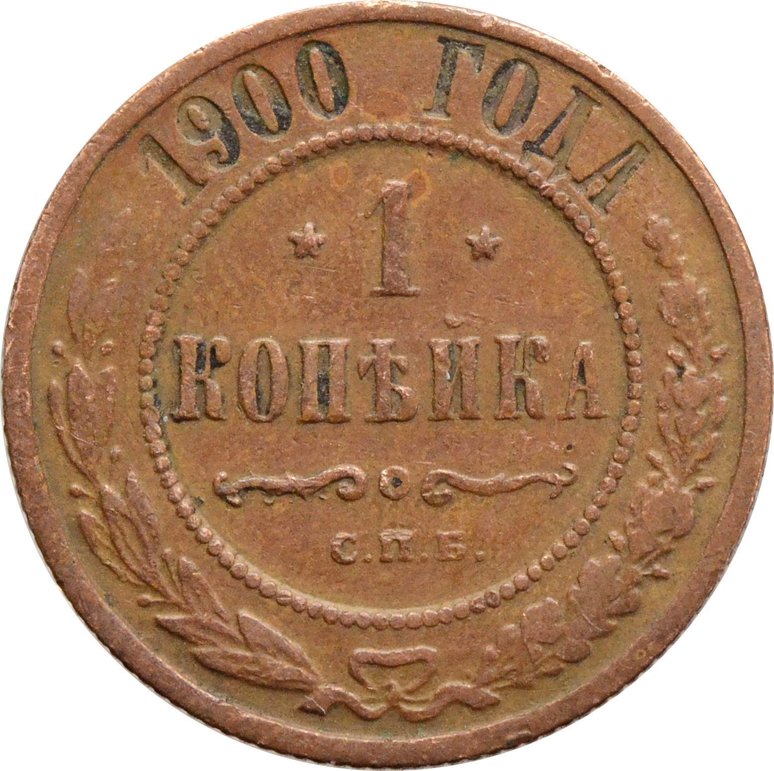 Реверс: в центре указан номинал: "1 КОПЕЙКА". Под номиналом, расположен декоративный разделитель. Под разделителем можно увидеть обозначение монетного двора: "С.П.Б.". Центральная часть отделена от остального изображения, окружностью в виде точек. В верхней части полукругом, вдоль канта, расположен год чеканки: "1900 ГОДА". Ниже этой надписи, вдоль канта, изображен венок из лавровой и дубовой ветвей, которые, в нижней части, перевязаны лентой на узел бантом.