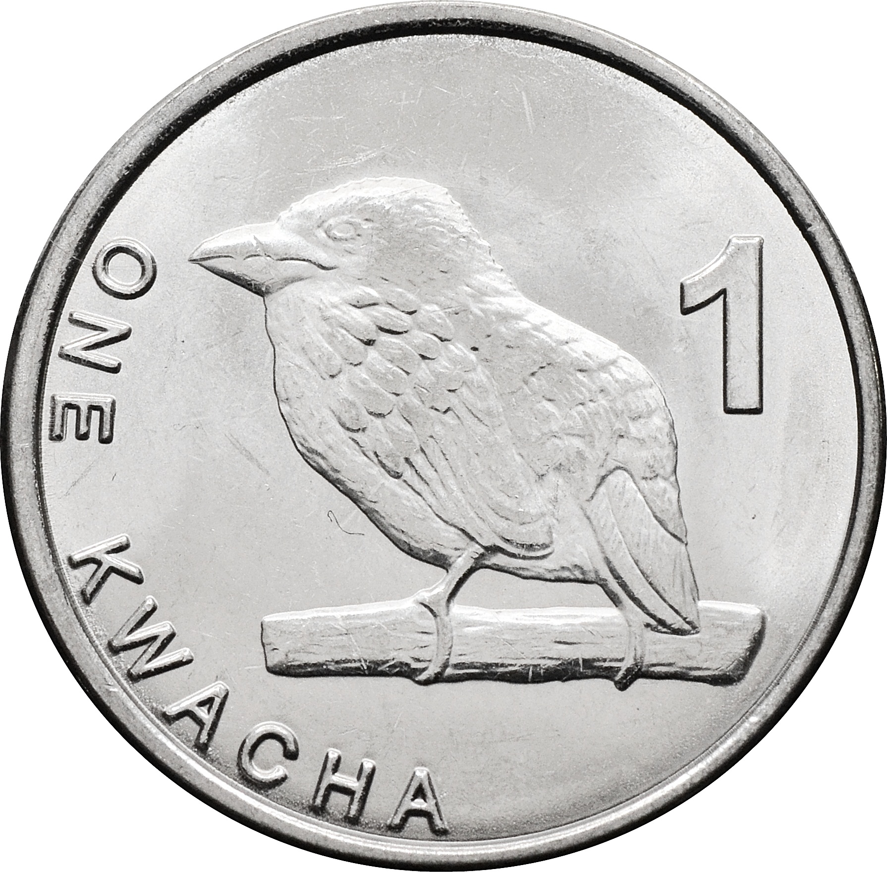 Реверс: по центру изображен замбийский дятел. Под ним номинал прописью: "ONE KWACHA", а слева чуть выше цифрой: "К 1".