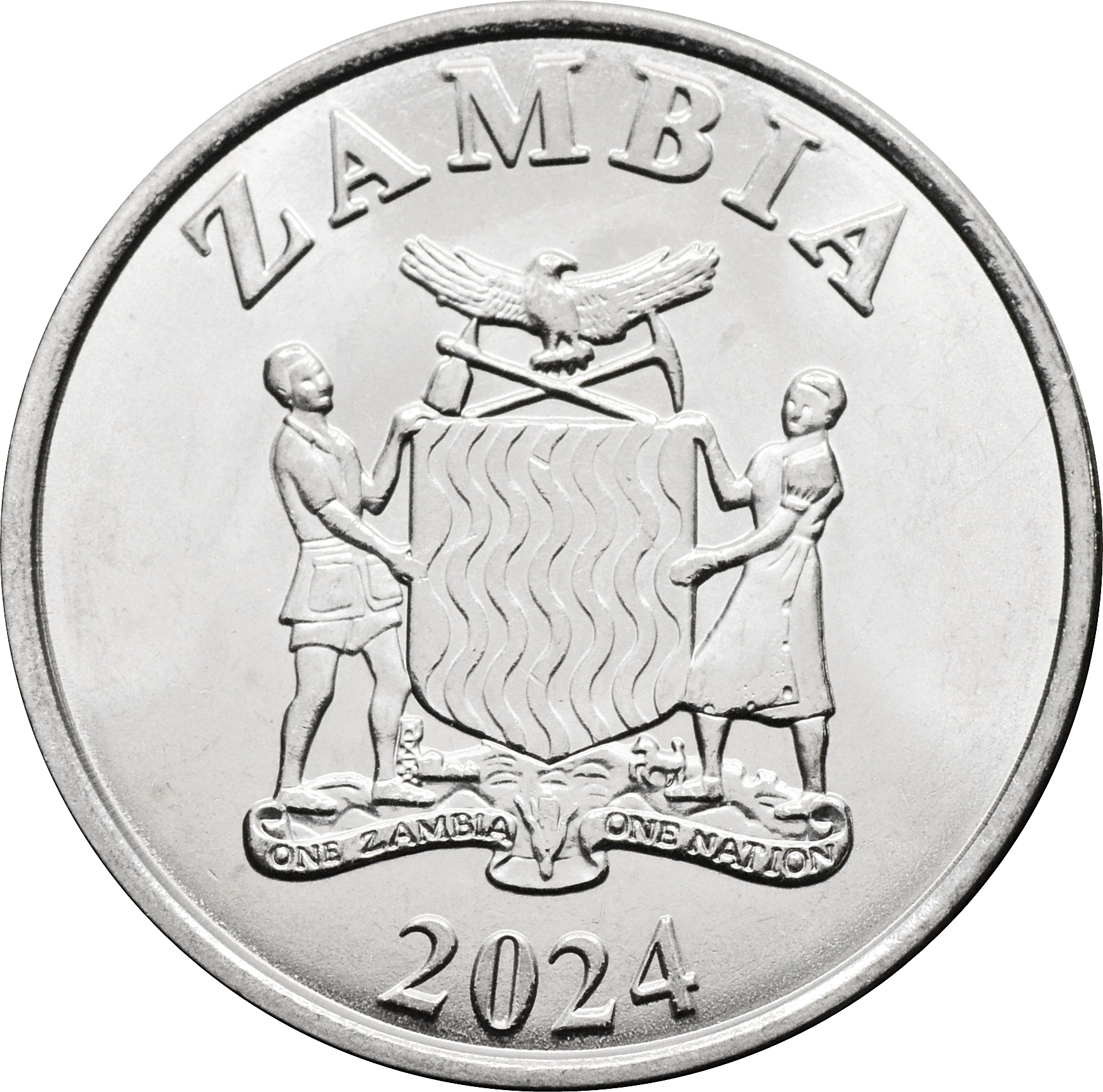 Аверс: в центре монеты изображен герб Замбии. Сверху надпись: "ZAMBIA". В самом низу указан год чеканки: "2024".