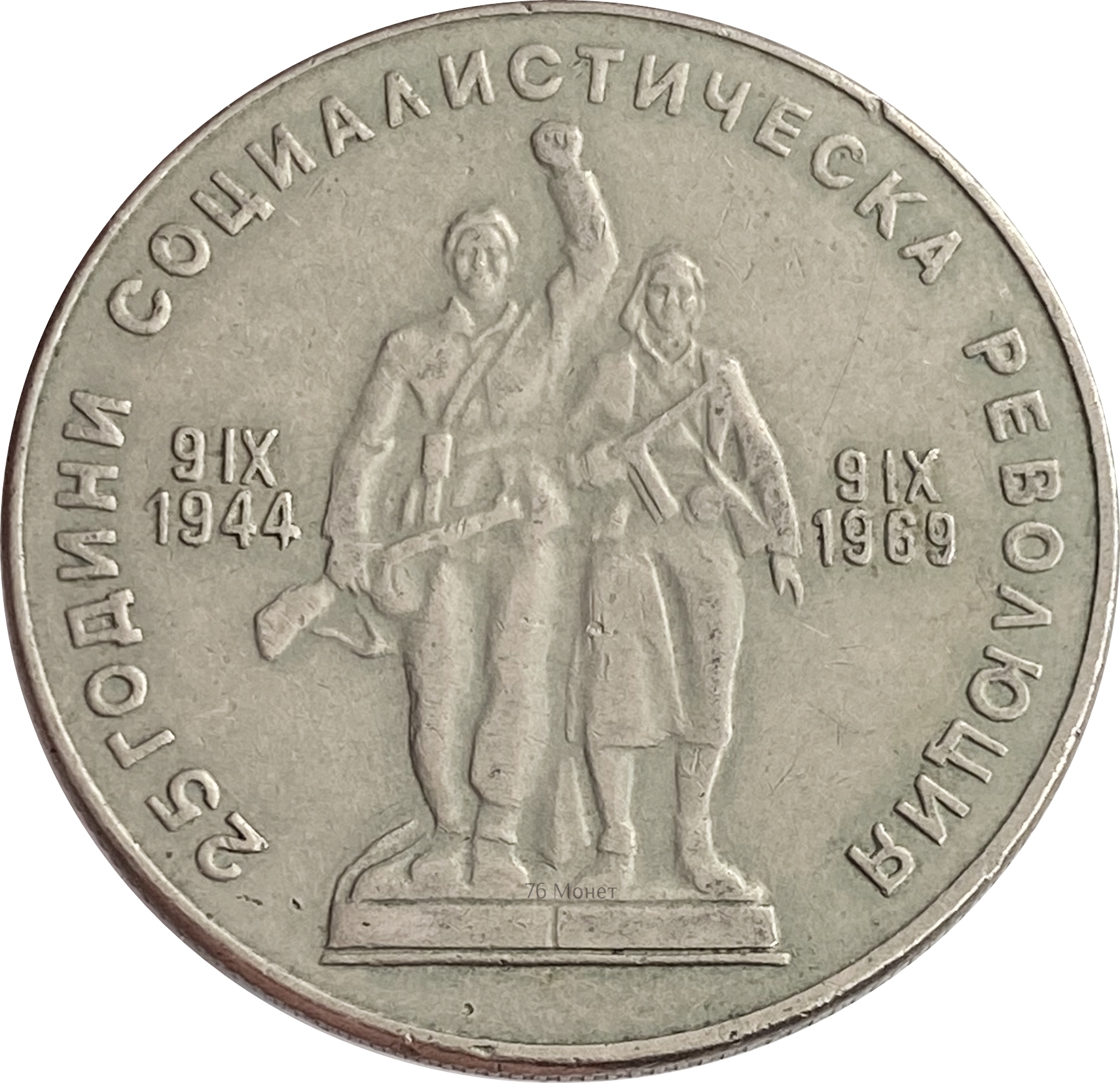 Реверс: по центру изображен монумент. Вдоль канта, по кругу, надпись: "25 ГОДИНИ СОЦИАЛИСТИЧЕСКА РЕВОЛЮЦИЯ".