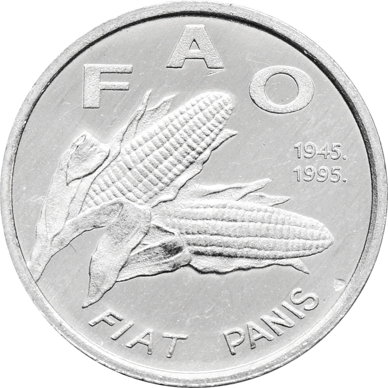 Аверс: в центре изображение кукурузы. Над ним надпись: "FAO". Снизу надпись полукругом: "FIAT PANIS".