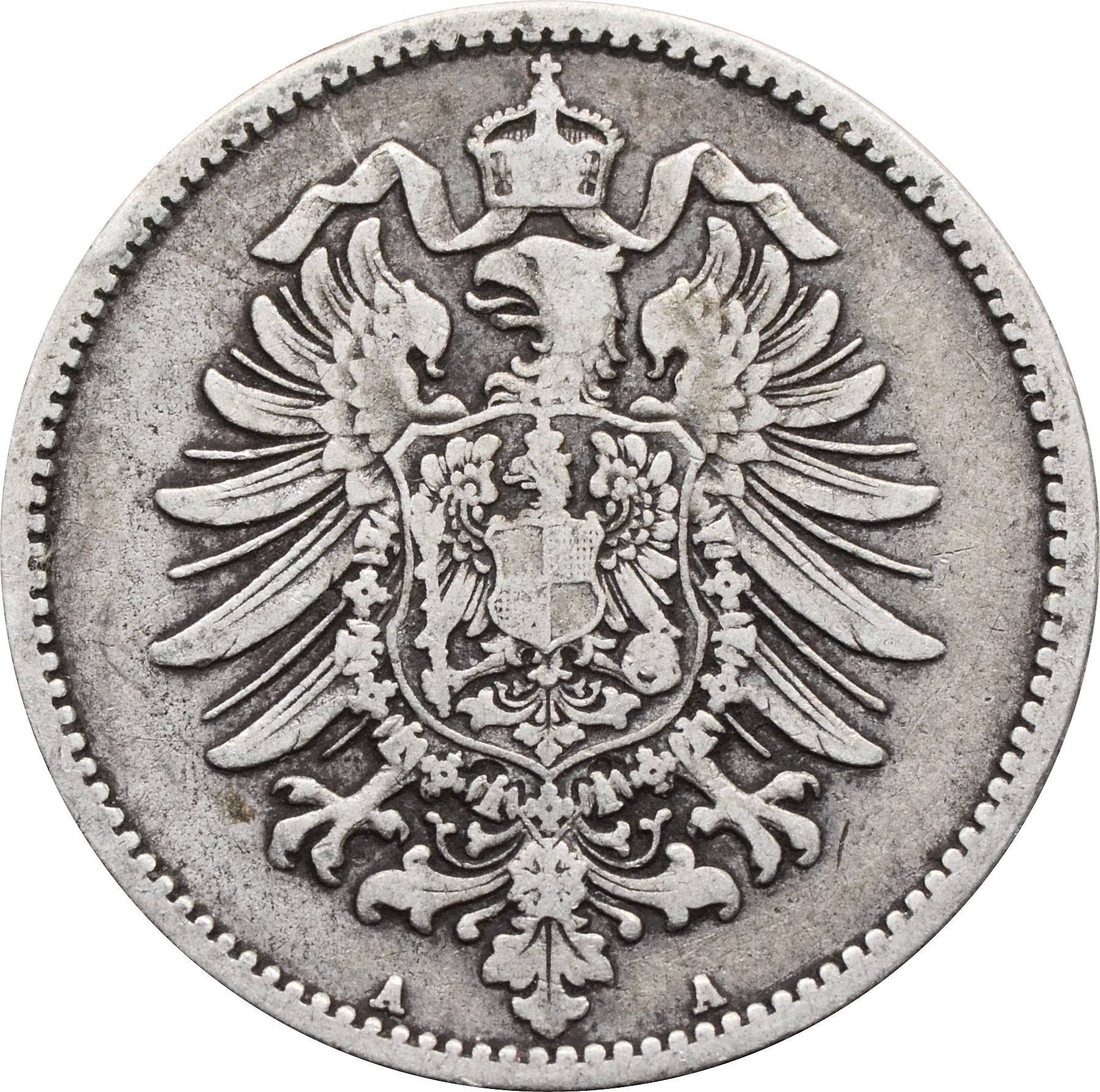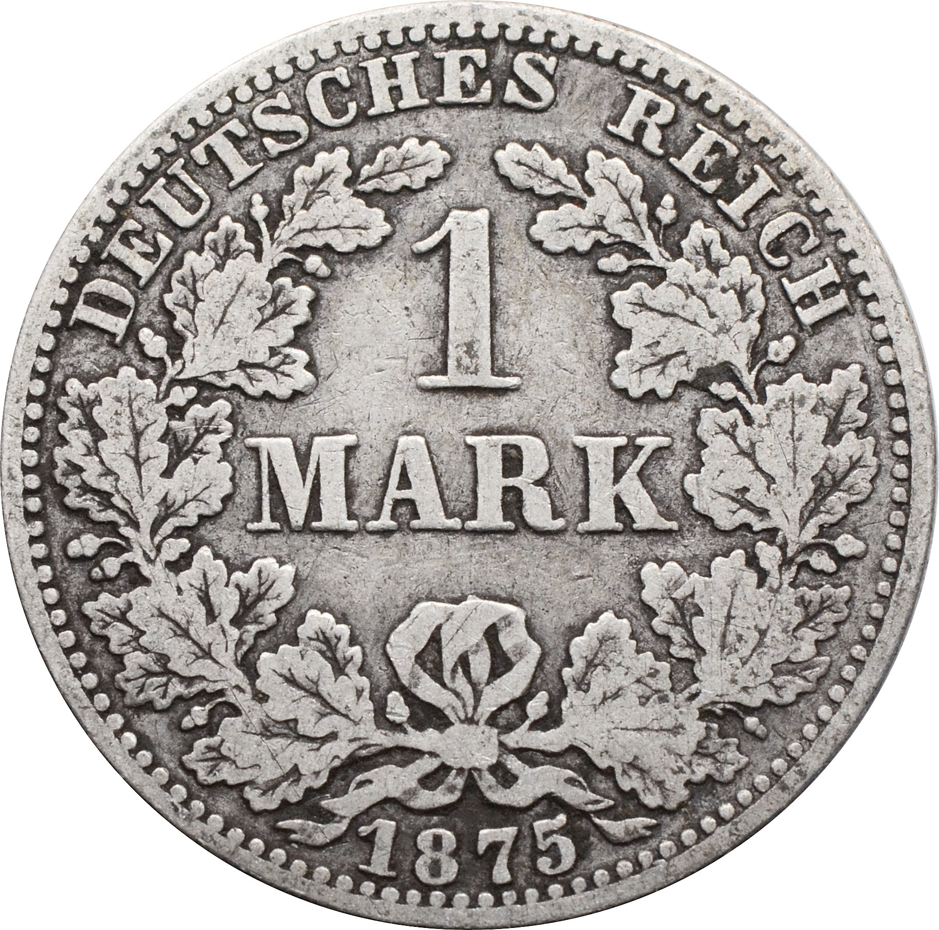 Реверс: по центру монеты указан номинал: "1 MARK", снизу год чеканки: "1875". Сверху полукругом надпись: "Deutsches Reich"
