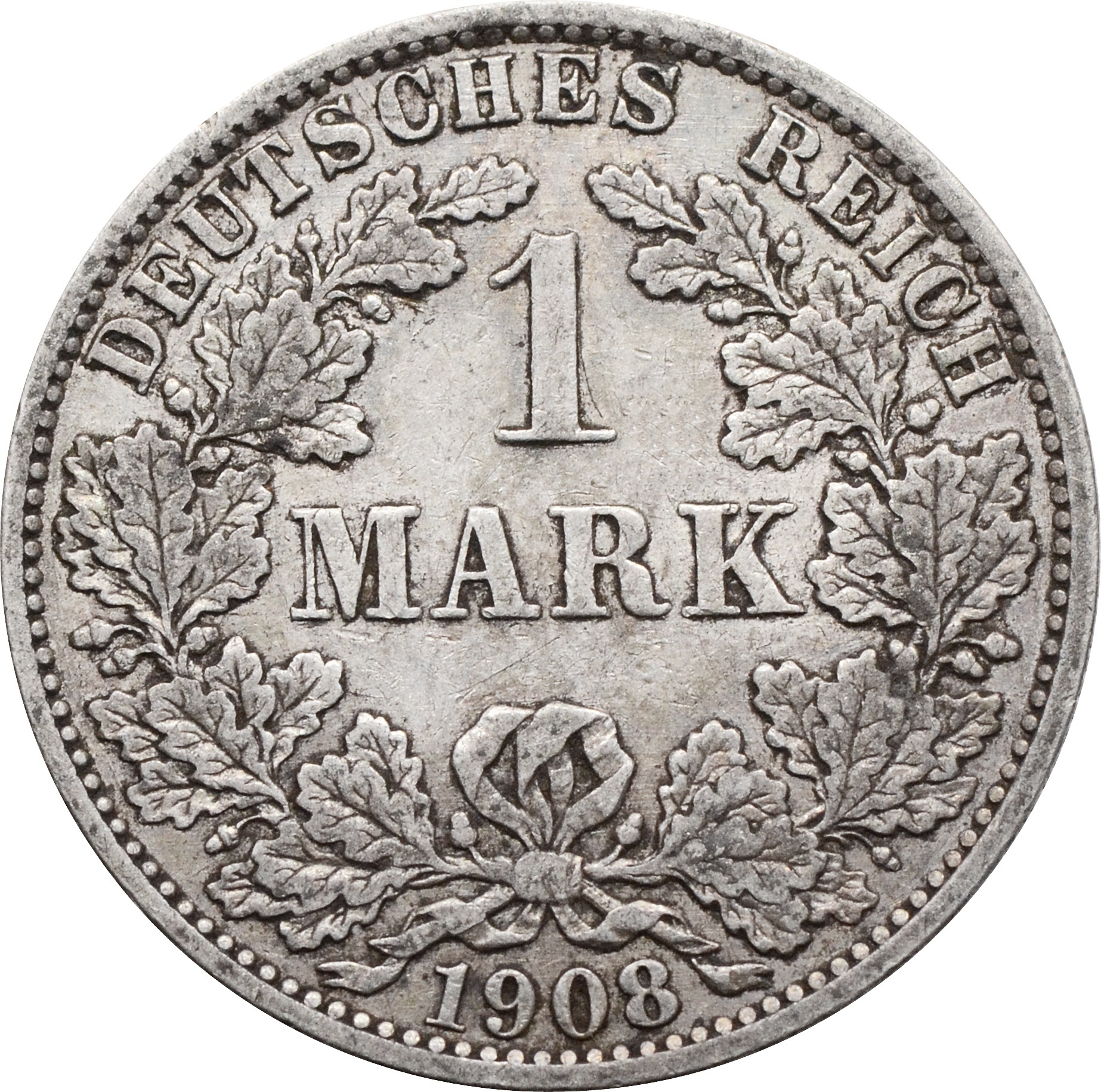 Реверс: по центру монеты указан номинал: "1 MARK", снизу год чеканки: "1908". Сверху полукругом надпись: "Deutsches Reich"