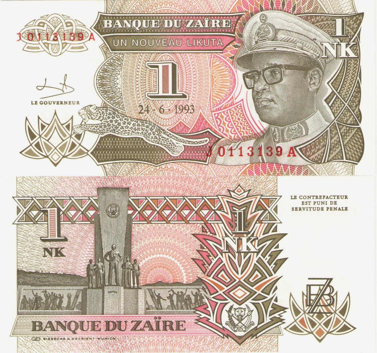 Лицевая сторона: правее центра банкноты размещен портрет конголезского политика Мобуту Сесе Секо. Правее номинал: "5NK"". По центру надпись: "BANQUE DU ZAIRE". Ниже номинал прописью т цифрой: "UN NOUVEAU LIKUTA 1". В левом верхнем углу и по центру снизу размещен серийный номер банкноты. По центру дата: "24-6-1993".