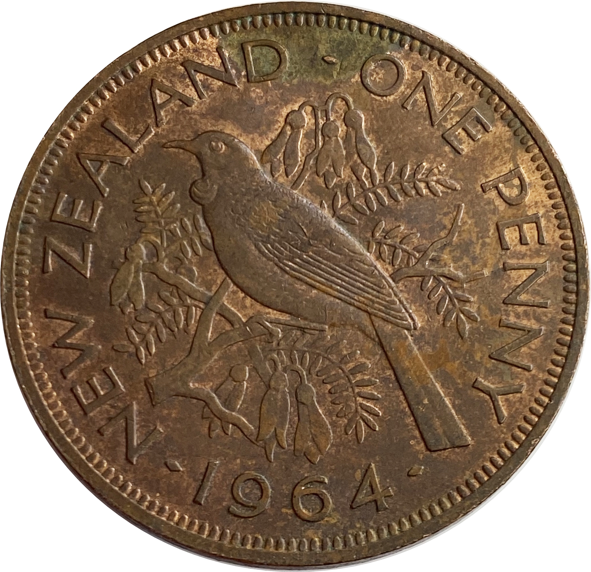 Реверс: по центру изображение птицы. Вдоль канта надпись: "NEW ZEALAND / ONE PENNY" и год чеканки: "1964".