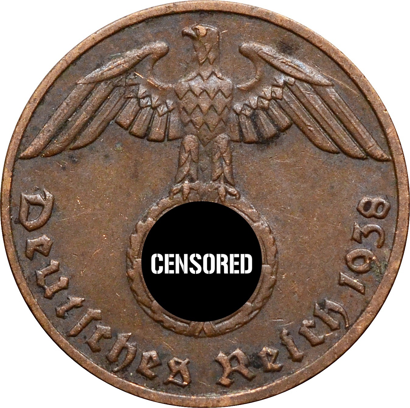 Аверс: по центру монеты изображен обращённый вправо геральдический орёл. Он держит в лапах венок со свастикой. Снизу, полукругом, надпись: "Deutsches Reich" и год чеканки: "1938".