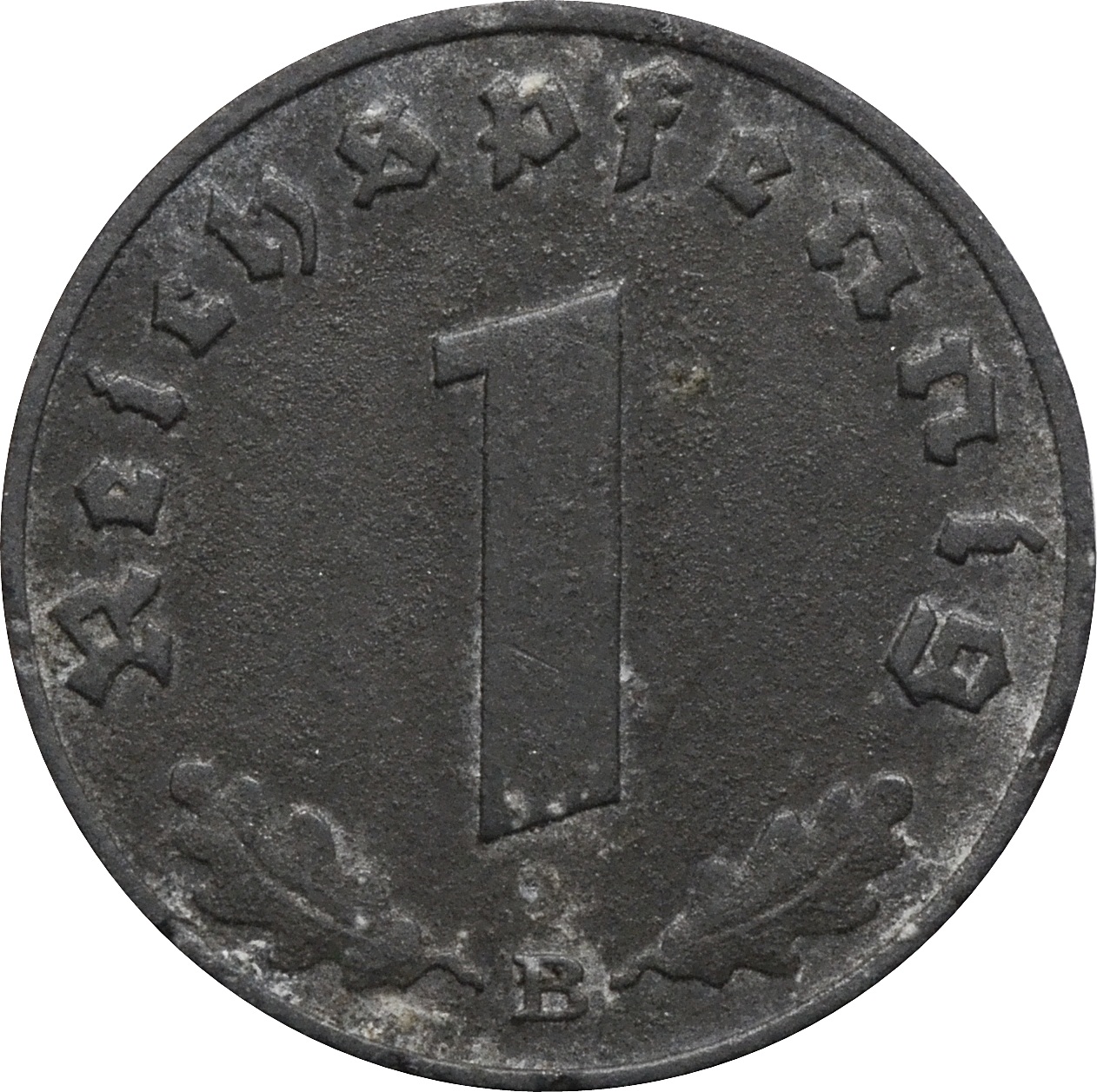 Реверс: в центре монеты указан номинал - цифра "1". Сверху надпись: "Reichspfennig". Под номиналом изображены два дубовых листа и буква монетного двора: "B".