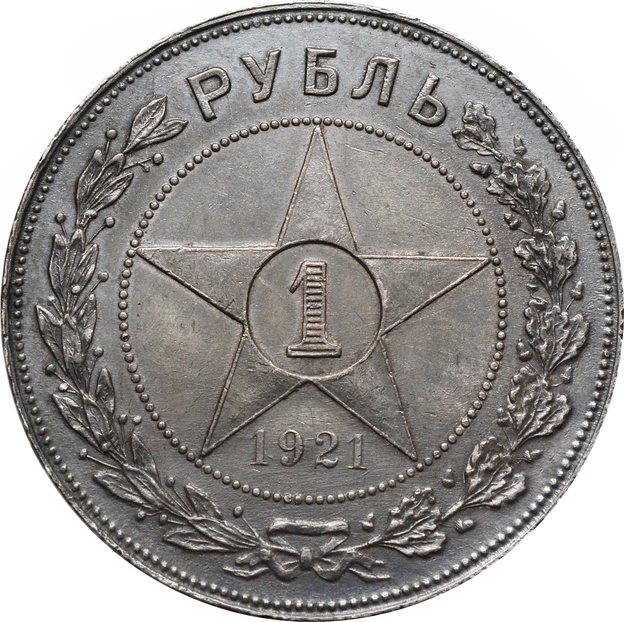 Реверс: по центру монеты указан номинал цифра - "1" в звезде. Ниже год чеканки монеты: "1921". Под годом чеканки, вдоль канта, расположен импровизированный венок. Сверху указан номинал прописью: "РУБЛЬ".