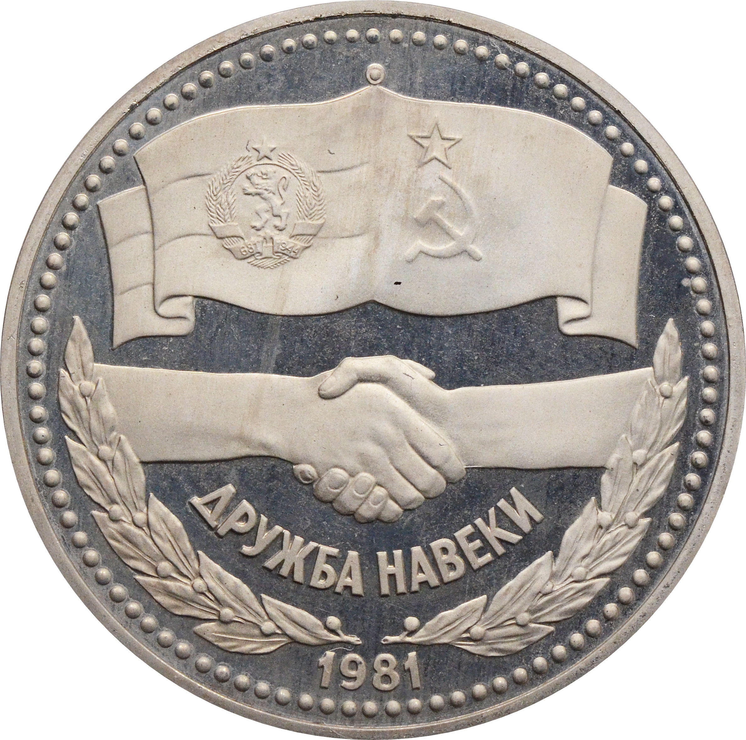 Реверс: в верхней части монеты изображение государственных флагов СССР и НРБ. По центру изображение рукопожатия, символизирующего дружбу советского и болгарского народов. Чуть ниже, полукругом, надпись: "ДРУЖБА НАВЕКИ". Внизу год чеканки монеты: "1981".