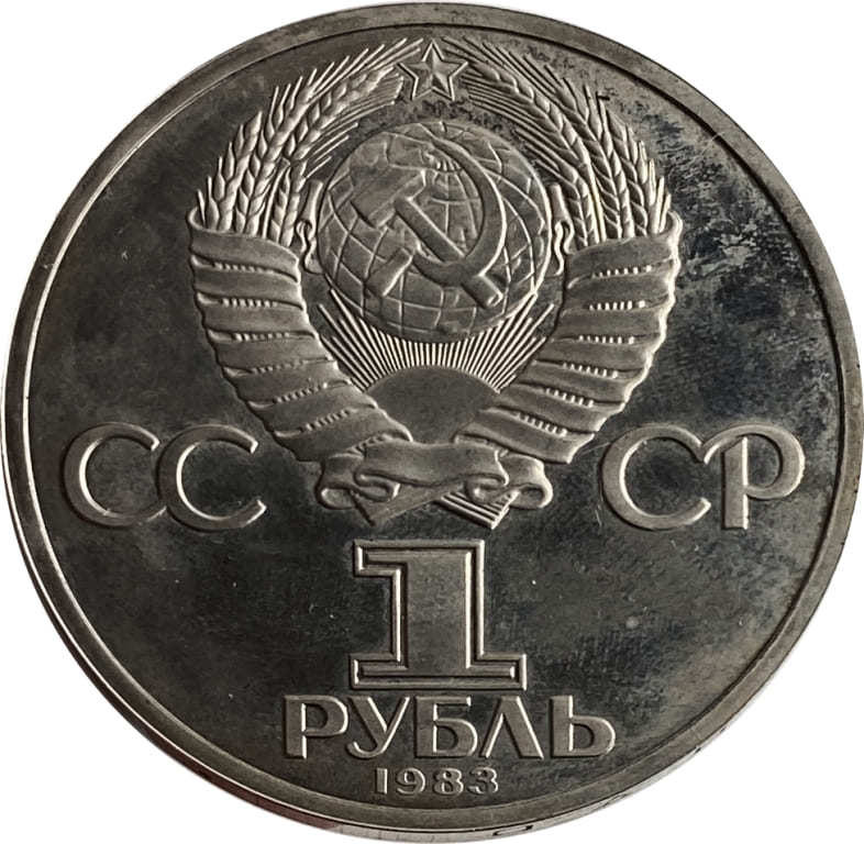 Аверс: в верхней части монеты изображен герб Советского союза с 15-ю витками ленты. Под ним содержится надпись: "СССР", разделенная пополам гербом. Снизу обозначение номинала в две строки: "1 РУБЛЬ". В самом низу указан год чеканки: "1983".