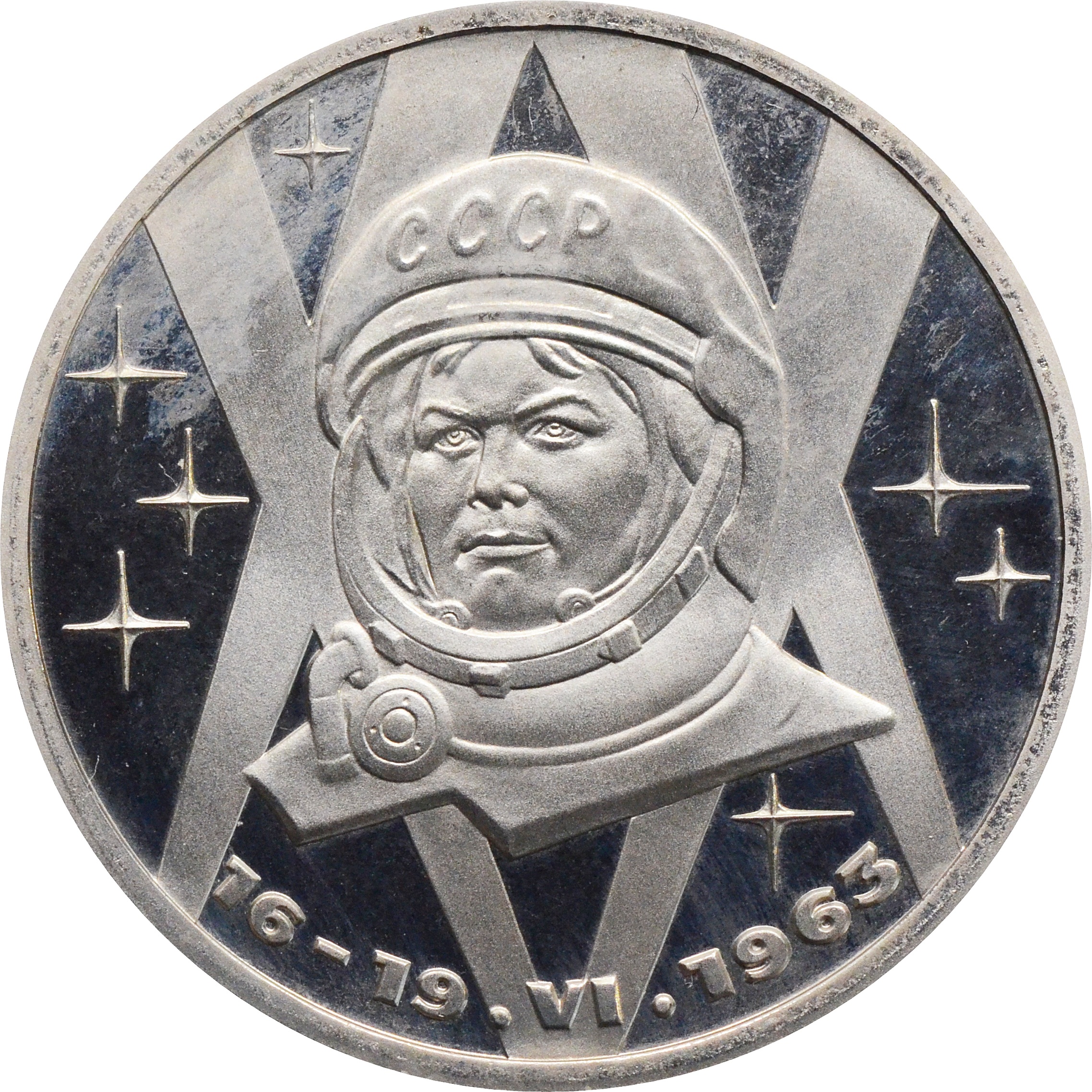 Реверс: по центру монеты, на фоне звездного неба и цифры «XX», изображение первой женщины-космонавта - В. В. Терешковой. Снизу, полукругом даты: "16-19.VI. 1963".