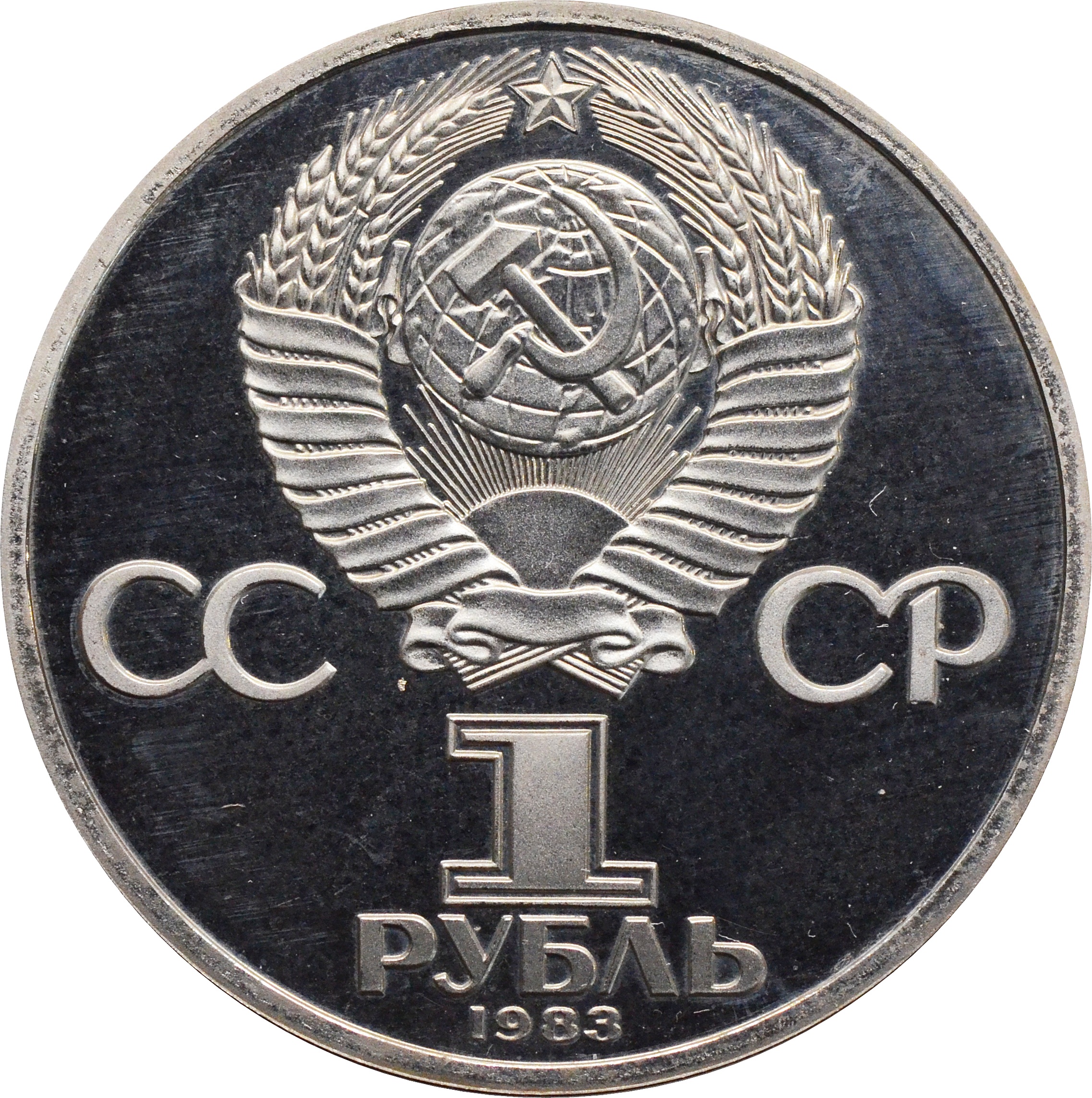 Аверс: в верхней части монеты изображен герб Советского союза с 15-ю витками ленты. Под ним содержится надпись: "СССР", разделенная пополам гербом. Снизу обозначение номинала в две строки: "1 РУБЛЬ". В самом низу указан год чеканки: "1983".