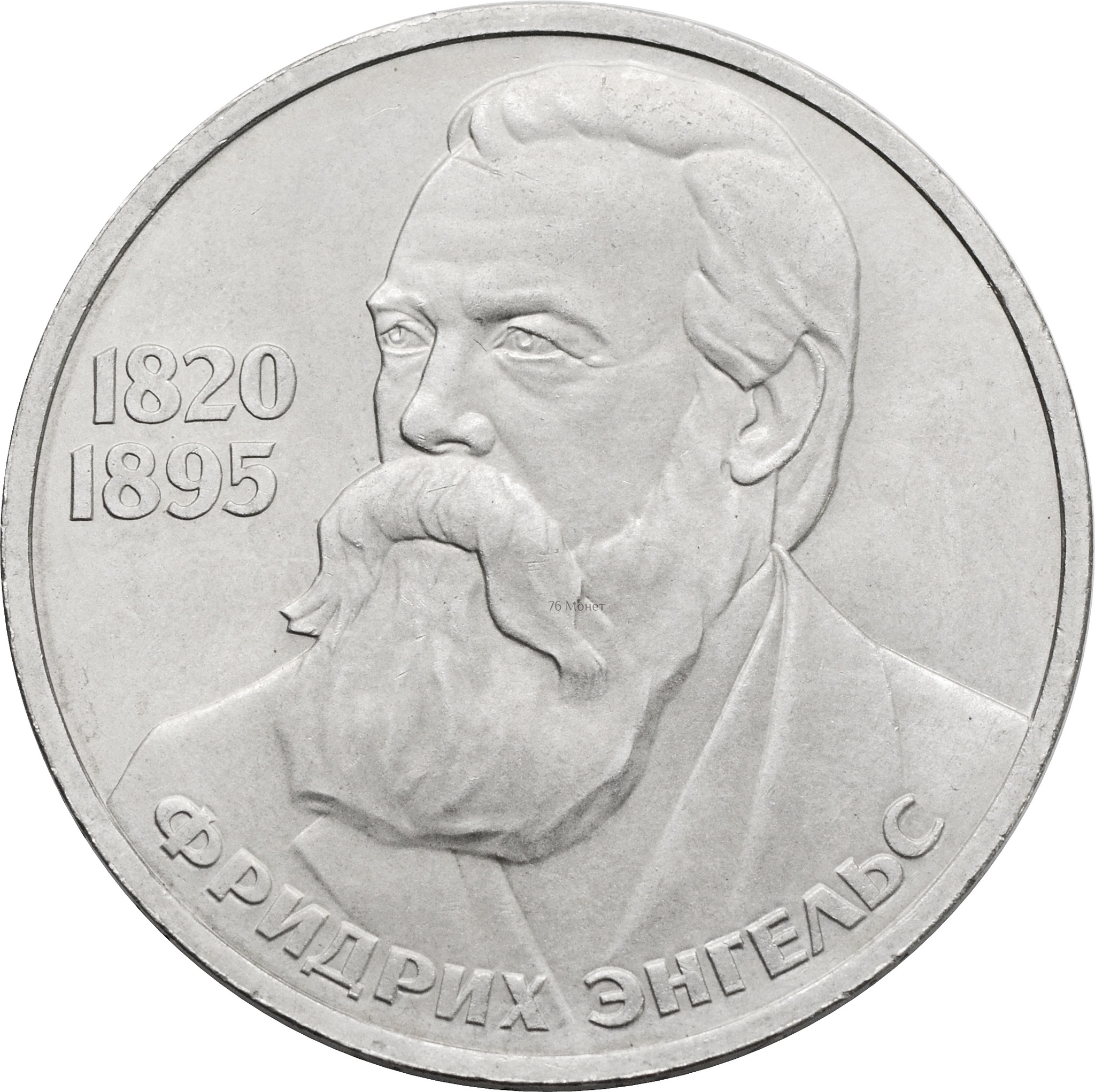 Реверс: по центру монеты изображение Фридриха Энгельса. Слева от него в две строки даты: "1820" и "1895", а в нижней части полукругом подпись: "ФРИДРИХ ЭНГЕЛЬС".