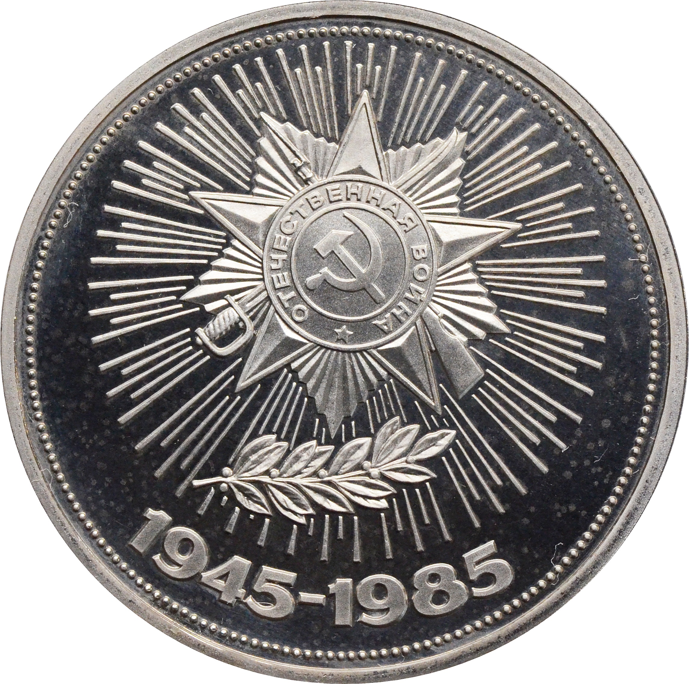 Реверс: по центру монеты изображение изображения ордена Отечественной войны и лавровой ветви, а в нижней части даты: "1945-1985".