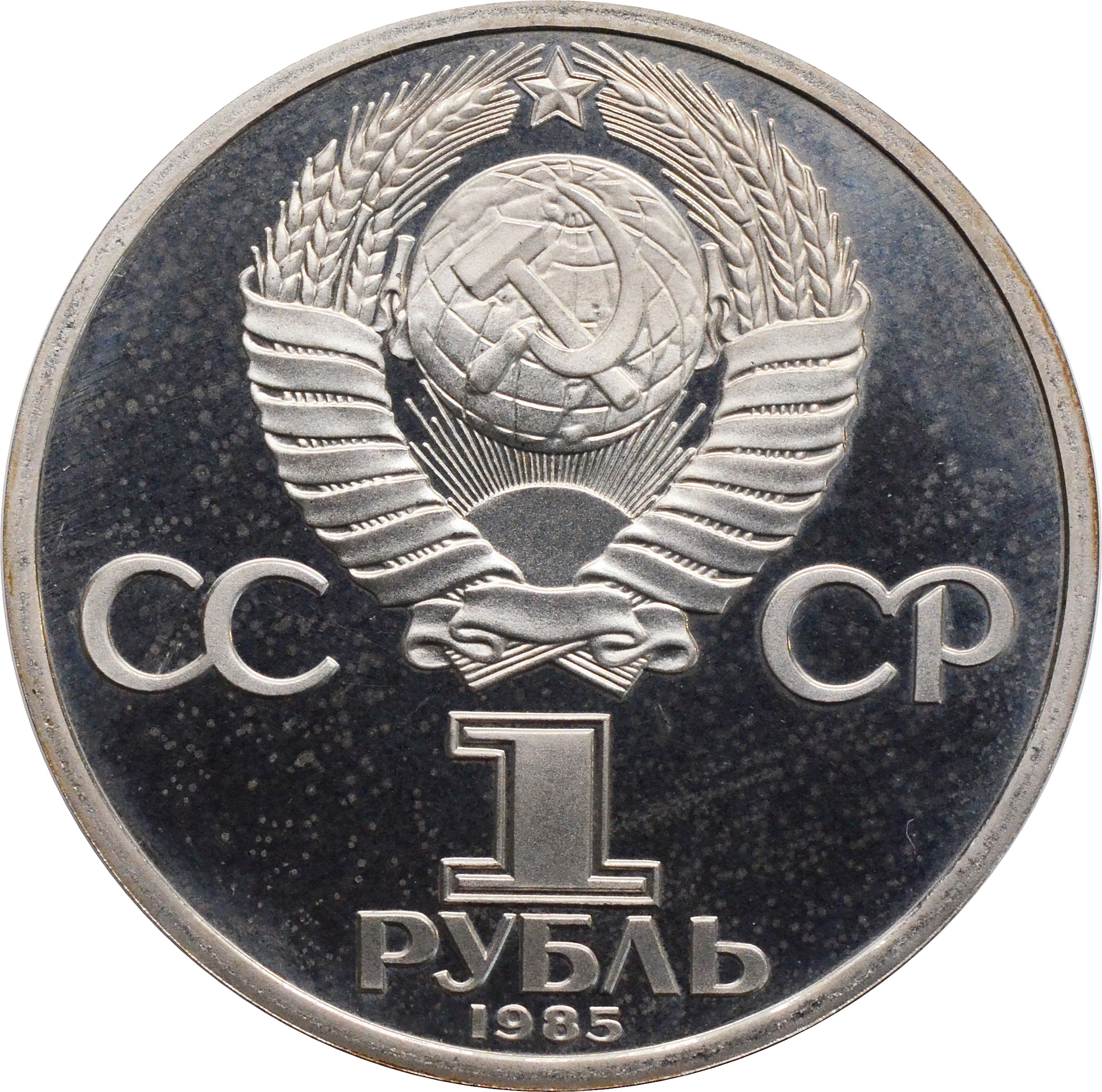 Аверс: в верхней части монеты изображен герб Советского союза с 15-ю витками ленты. Под ним содержится надпись: "СССР", разделенная пополам гербом. Снизу обозначение номинала в две строки: "1 РУБЛЬ". В самом низу указан год чеканки: "1985".