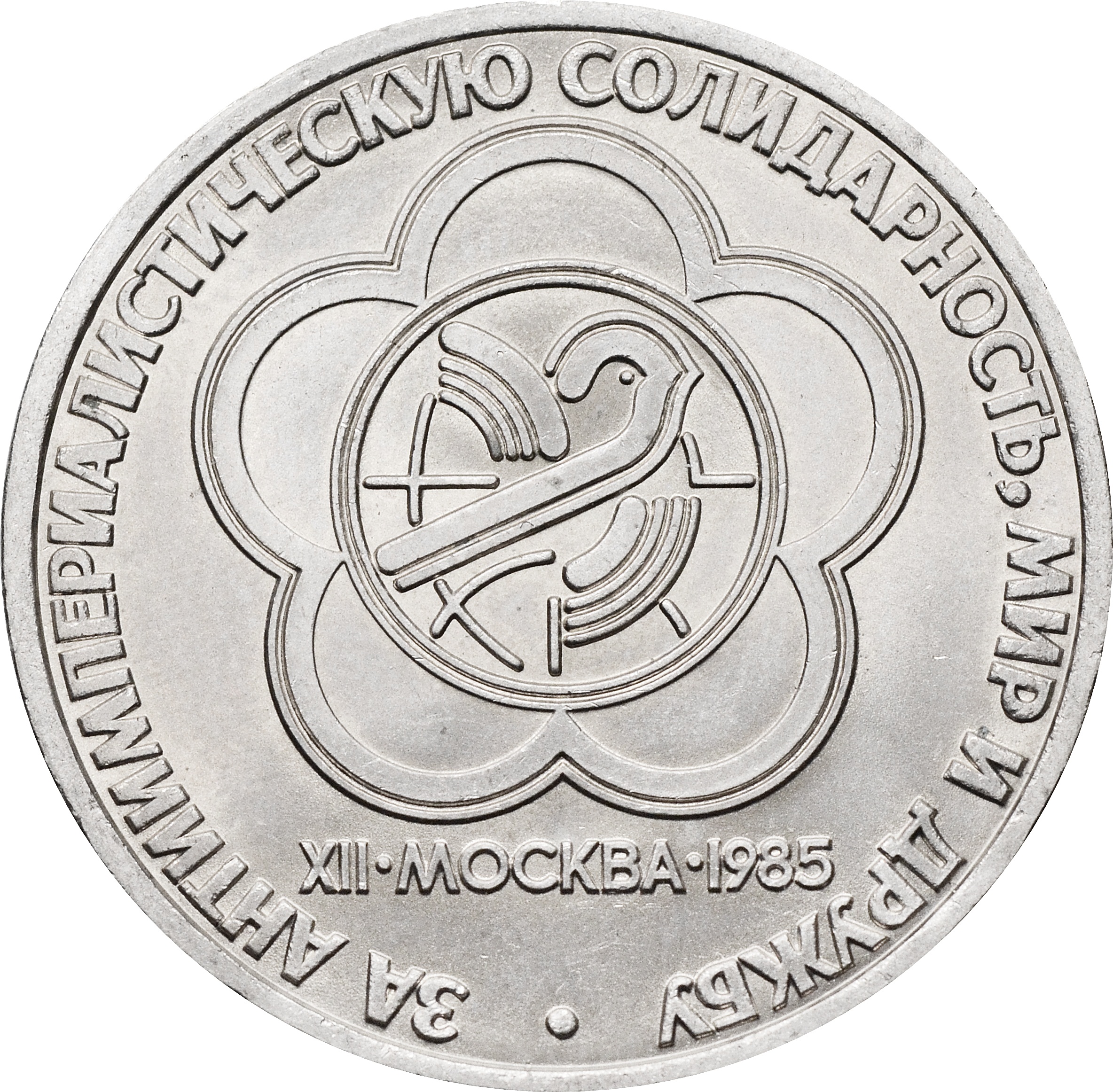 Реверс: по центру изображен символ фестиваля. Под ним надпись: "XII москва 1985". По краю монеты надпись: "ЗА АНТИИМПЕРИАЛИСТИЧЕСКУЮ СОЛИДАРНОСТЬ, МИР И ДРУЖБУ".