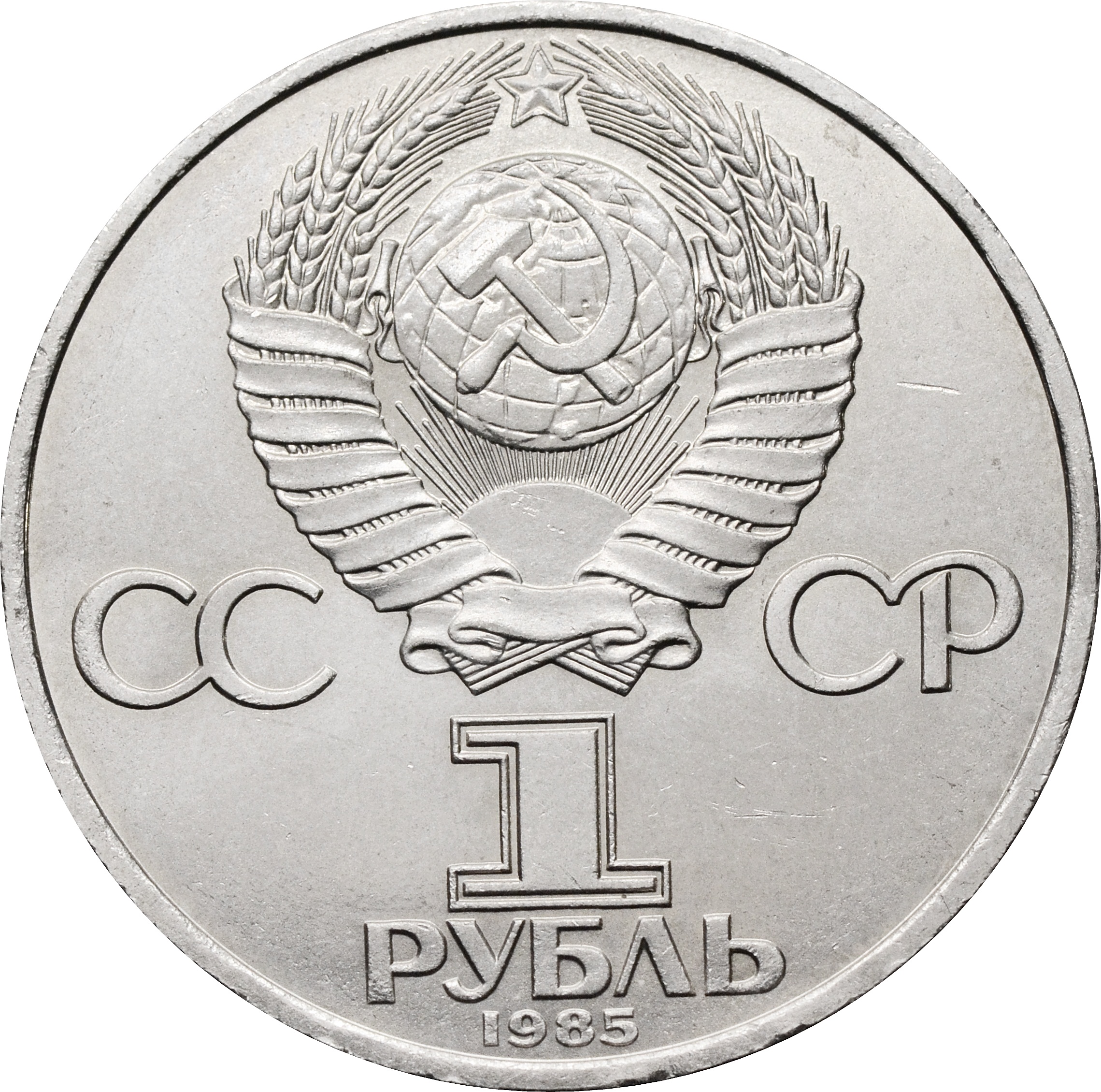 Аверс: в верхней части монеты изображен герб Советского союза с 15-ю витками ленты. Под ним содержится надпись: "СССР", разделенная пополам гербом. Снизу обозначение номинала в две строки: "1 РУБЛЬ". В самом низу указан год чеканки: "1985".