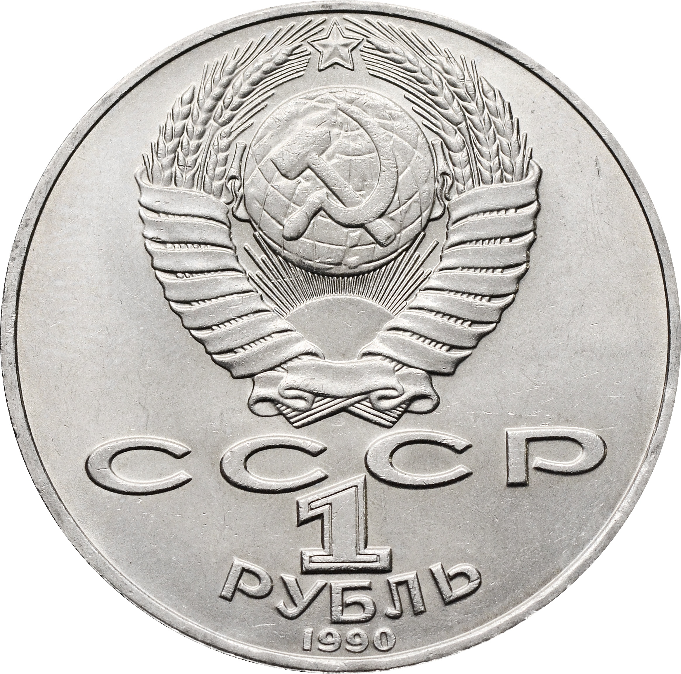 Аверс: в верхней части монеты изображен герб Советского союза с 15-ю витками ленты. Под ним содержится надпись: "СССР", разделенная пополам гербом. Снизу обозначение номинала в две строки: "1 РУБЛЬ". В самом низу указан год чеканки: "1990".