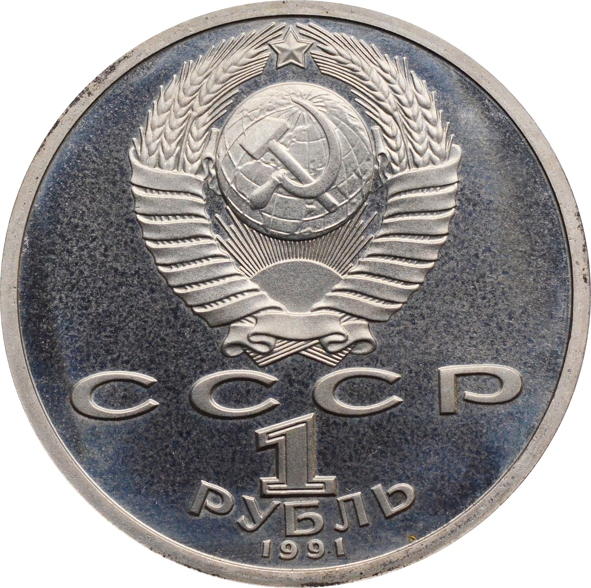 Аверс: в верхней части монеты изображен герб Советского союза с 15-ю витками ленты. Под ним содержится надпись: "СССР", разделенная пополам гербом. Снизу обозначение номинала в две строки: "1 РУБЛЬ". В самом низу указан год чеканки: "1991".