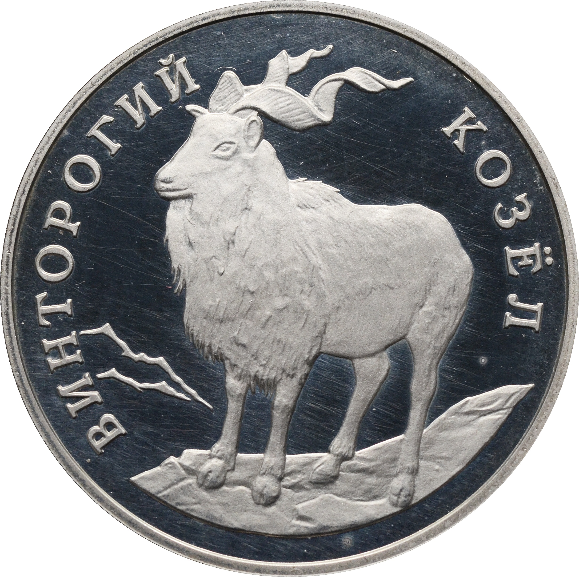 Реверс: левее центра монеты расположено рельефное изображение козла. Ниже надпись: "Винторогий козел".