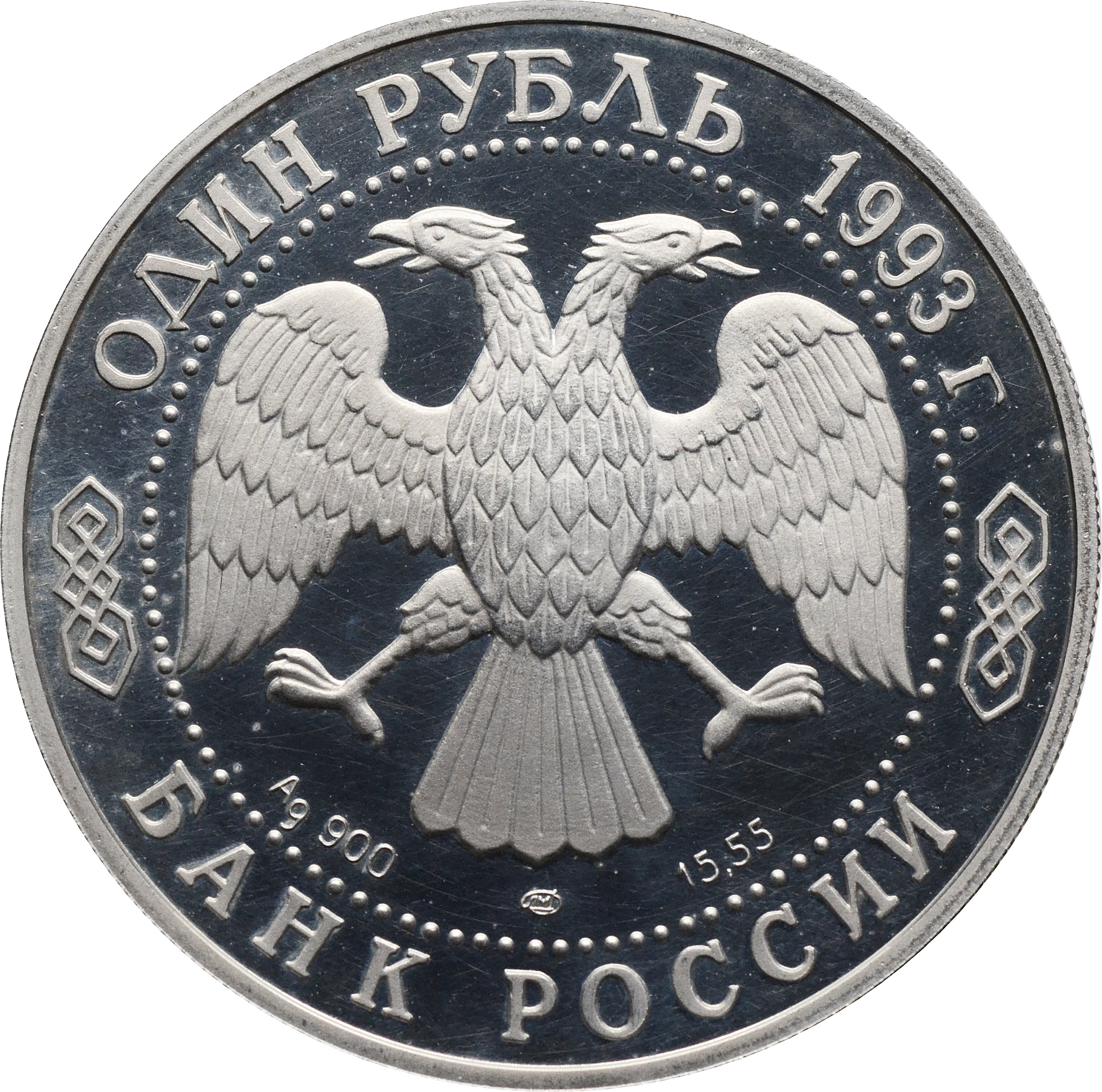 Аверс: в центре монеты герб Банка России. Над ним, вдоль канта, номинал полукругом: "ОДИН РУБЛЬ" и указан год чеканки: "1993г.". Снизу размещен товарный знак монетного двора - ЛМД и вес монеты: "15,55". Слева указан метал монеты: "Ag 900". Снизу, под гербом надпись: "БАНК РОССИИ".
